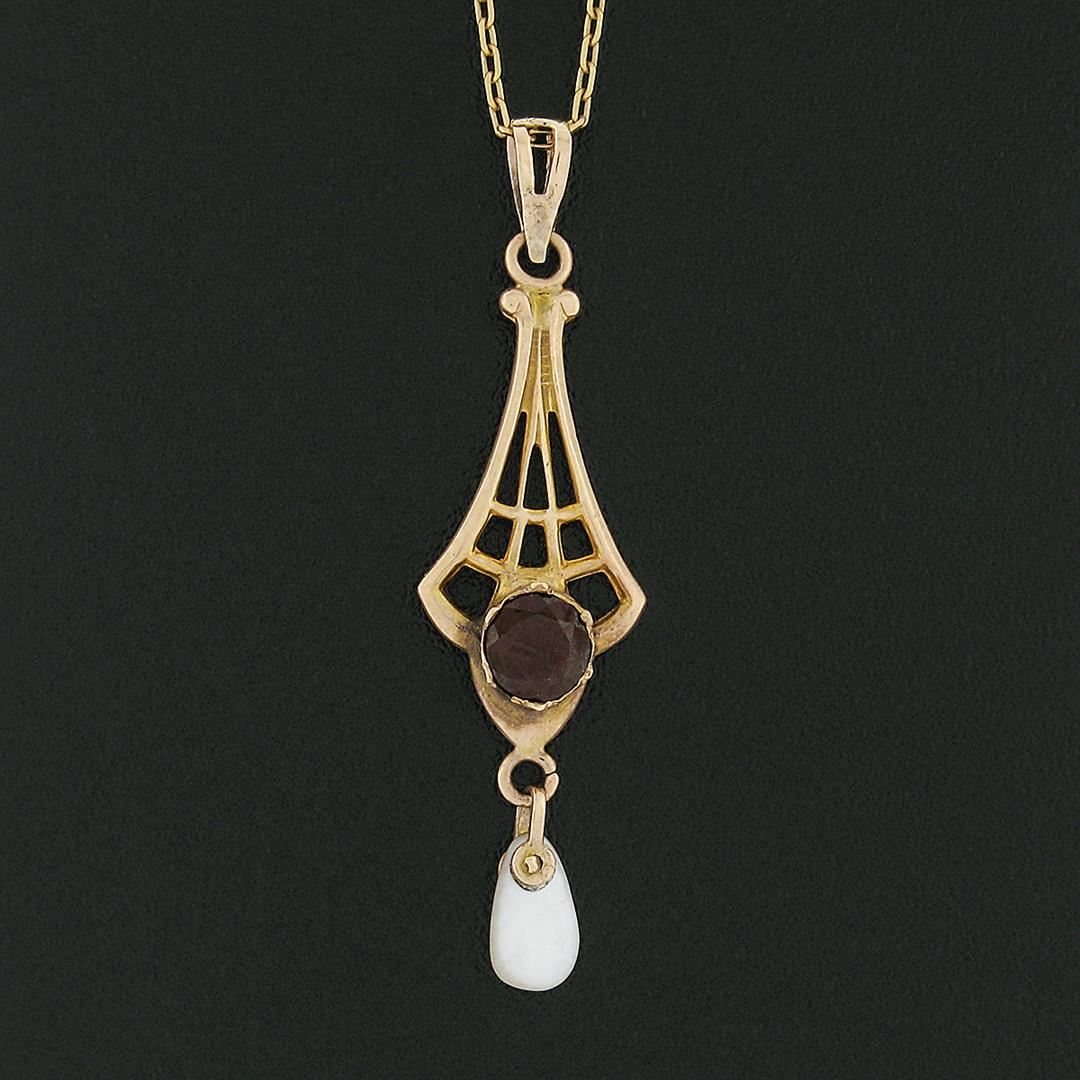 A victorian solid 10k yellow gold pendant with new 14k yellow gold chain necklace, featuring 1 round brilliant cut natural garnet (0.50ct), and 1 unique shape cultured mother of pearl (6.6x3.9mm). 16 inch cable link chain, 2.2 grams total weight, pendant measures 36.35x9.6mm.