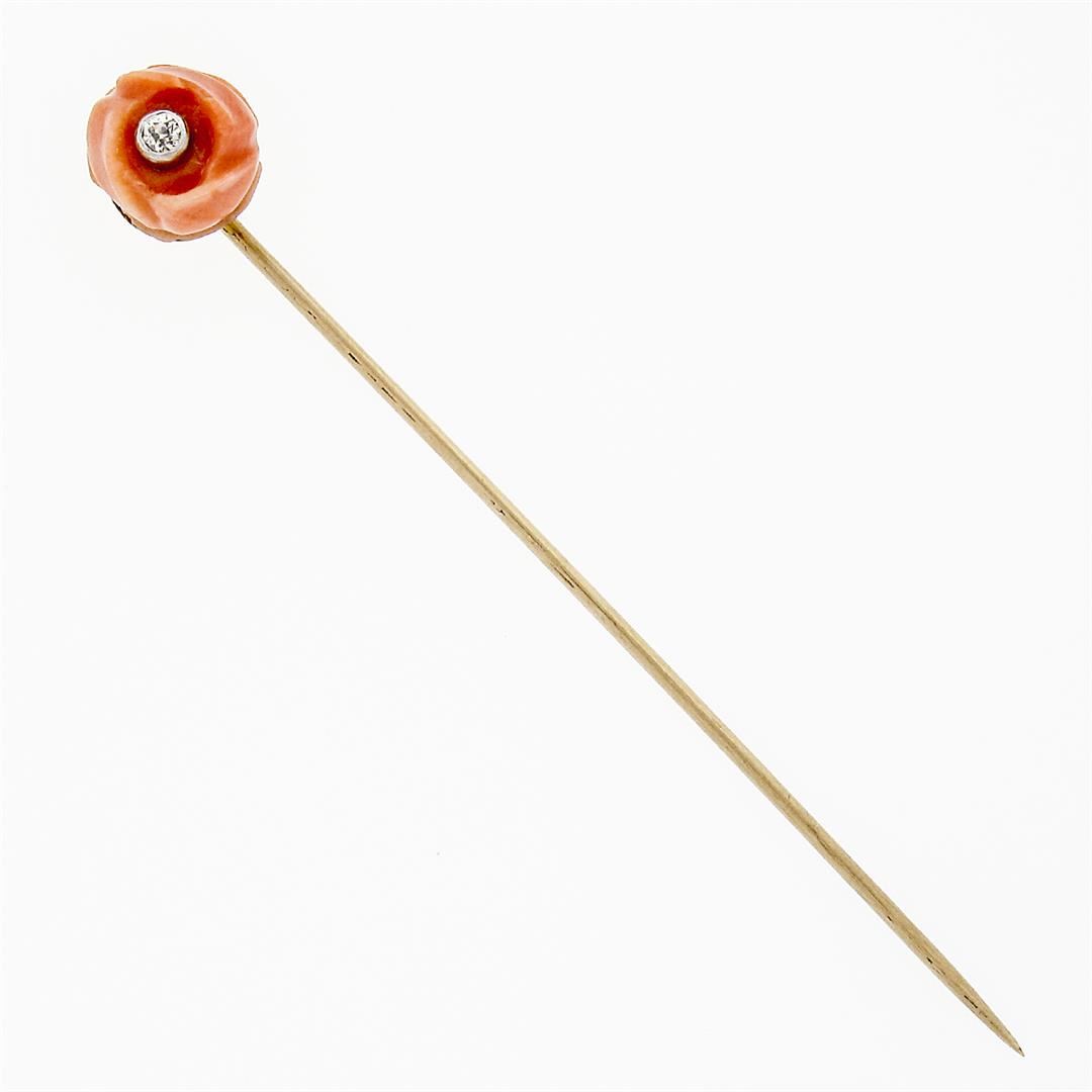A Victorian solid 10k yellow gold stick pin, with 1 round rose shape natural carved coral (8.04x8.24mm). Measures 64.04x8.24mm and weighs a total of 1.52 grams.