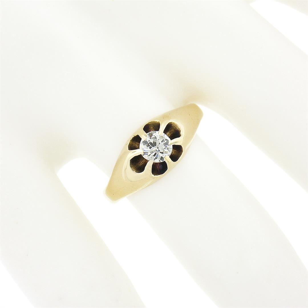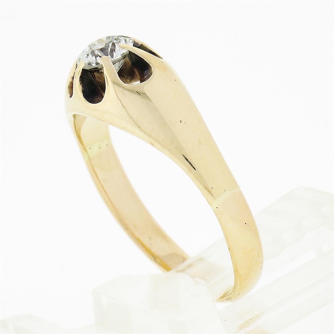 An antique solid 14k yellow gold solitaire ring, with 1 old mine cut natural diamond (H - VS2 ; 0.30ctw). The ring is size 6.5, weighs a total of 3.21 grams, and measures 7.35mm wide.