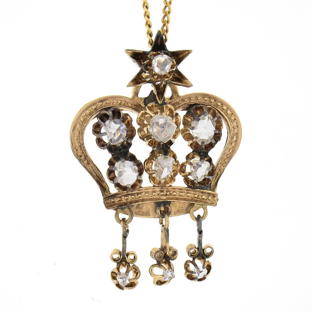 A antique solid 14k yellow gold dangle pendant necklace, with 10 old rose cut natural diamonds (G/H - SI1/SI2 ; 0.78ctw). 15.75 inch curb link chain, 5.81 grams total weight, pendant measures 32.40x21.70mm.