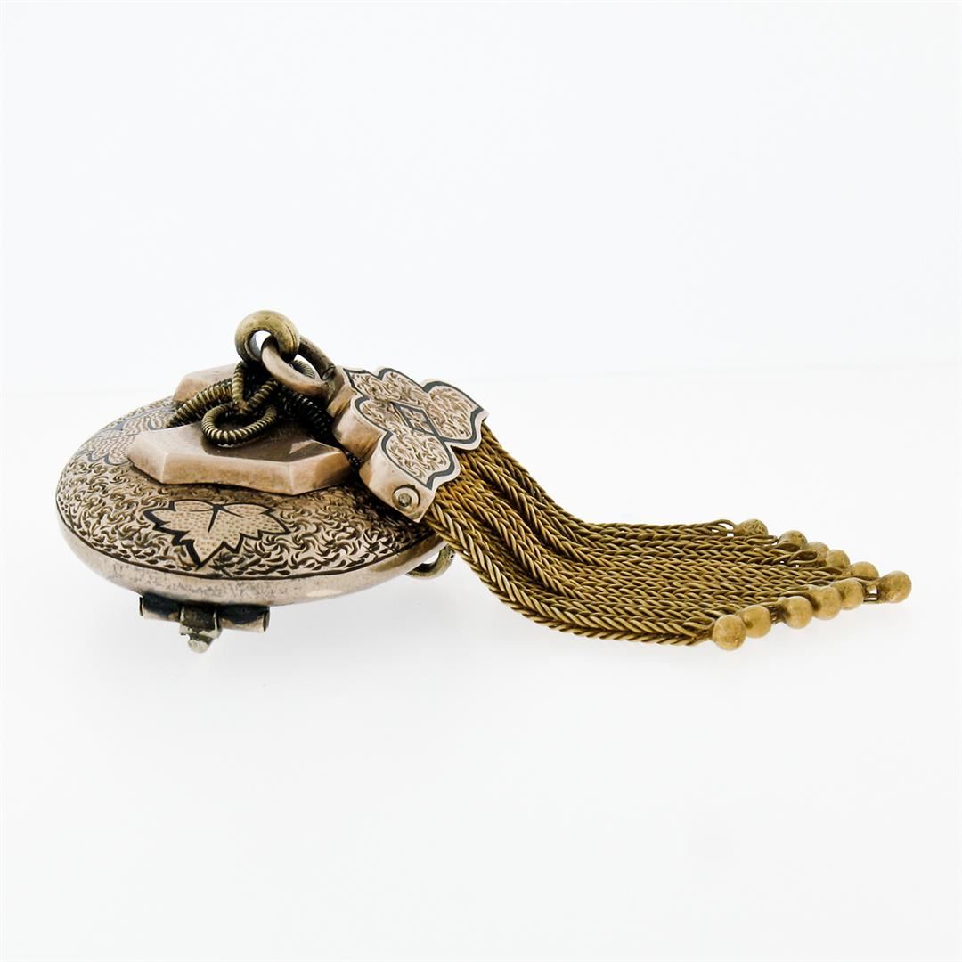 An antique victorian 14k yellow gold tassel dangle pin brooch, with black enamel work. Measures 56.0x32.85mm and weighs a total of 9.81 grams.
