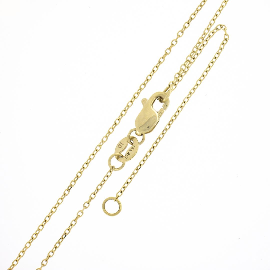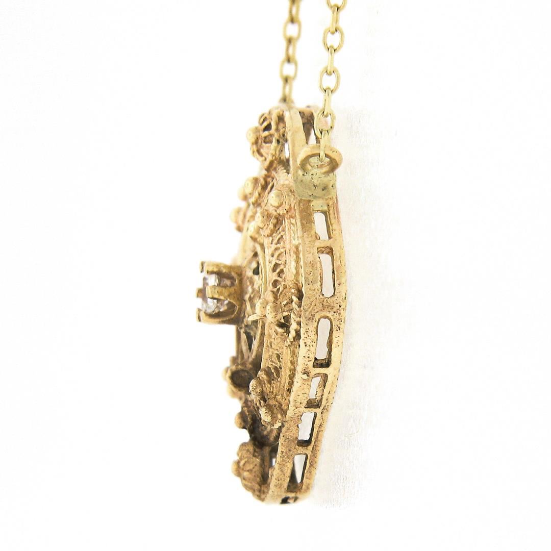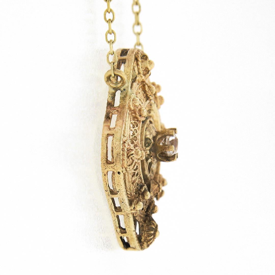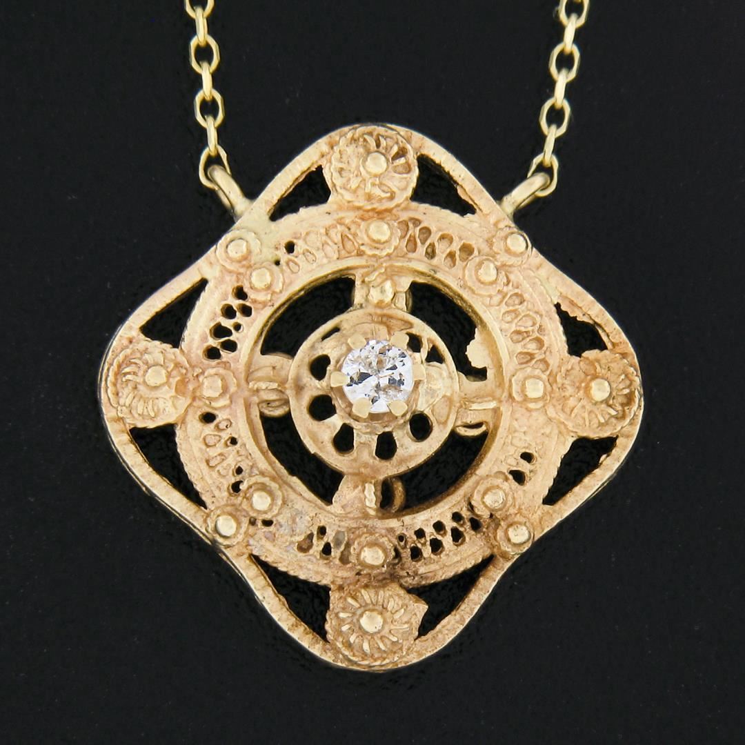 An antique solid 14k yellow gold pendant necklace, with 1 round cut cubic zirconia (2.1mm). Adjustable at 16 and 18 inch cable link chain, 2.50 grams total weight, pendant measures 16.45x16.35mm.