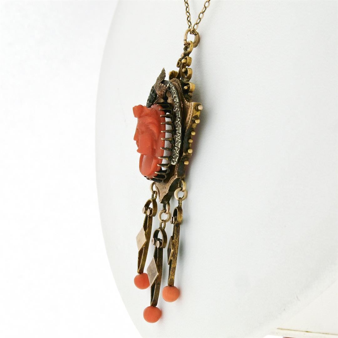 An antique solid 14k yellow gold dangle pendant necklace, with 1 oval cut carved natural coral (15.0x10.25mm), and 3 round bead shape natural corals (3.45-3.65mm ). 17 inch cable link chain, 6.34grams total weight, pendant measures 60.50x24.25mm.