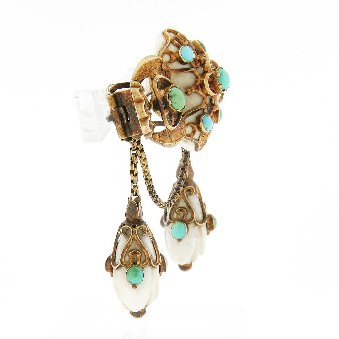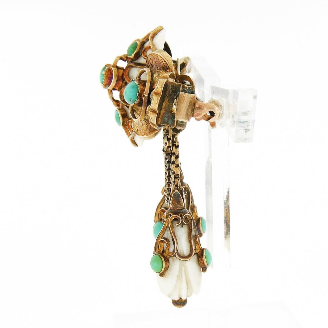 An antique solid 14k yellow gold brooch, with 13 round cabochon cut natural turquoises (4.45-2.75mm each), and 3 white stones ((1) 22x13.5mm & (2) 14.2x8mm each). Measures 48.9x40.15mm and weighs a total of 13.71 grams.