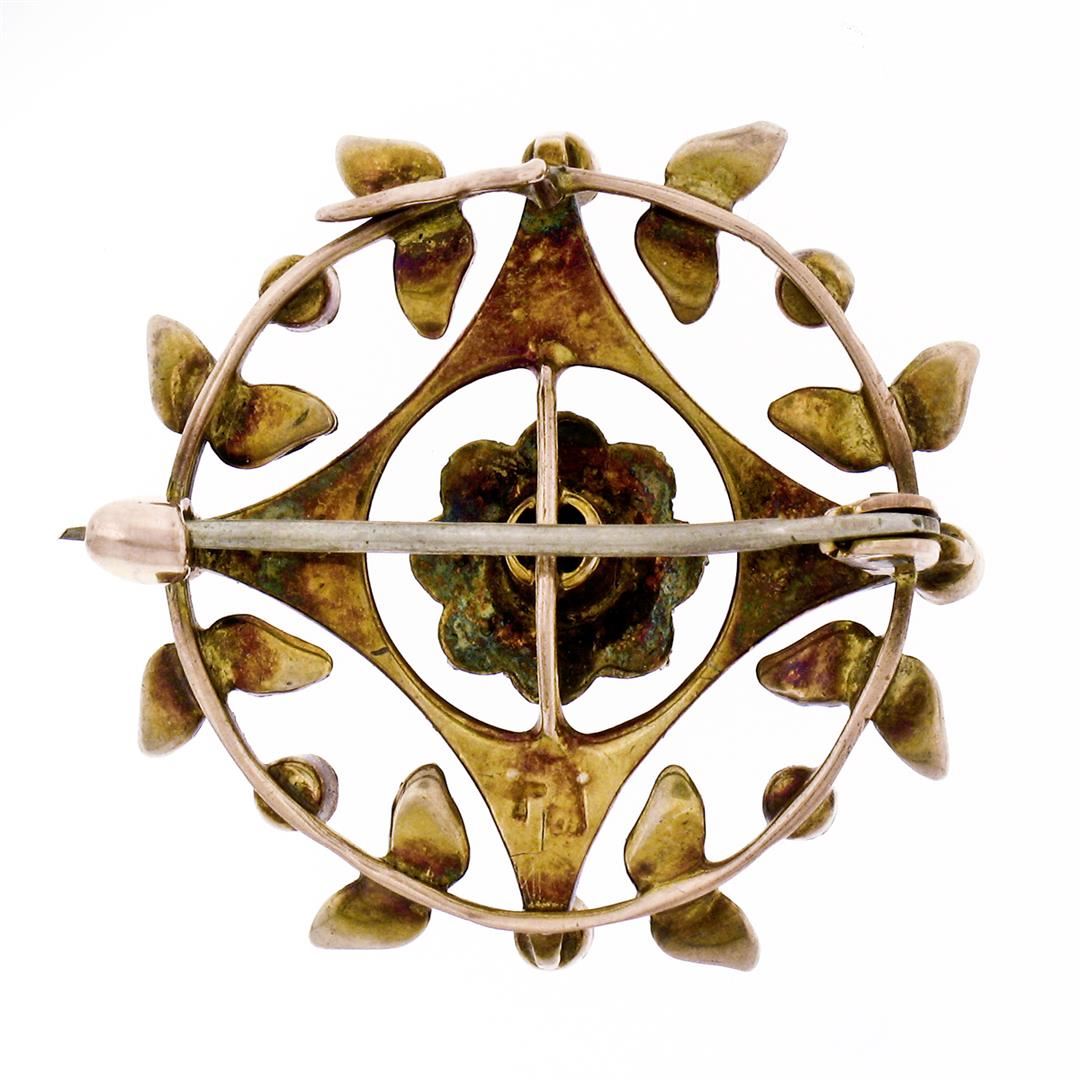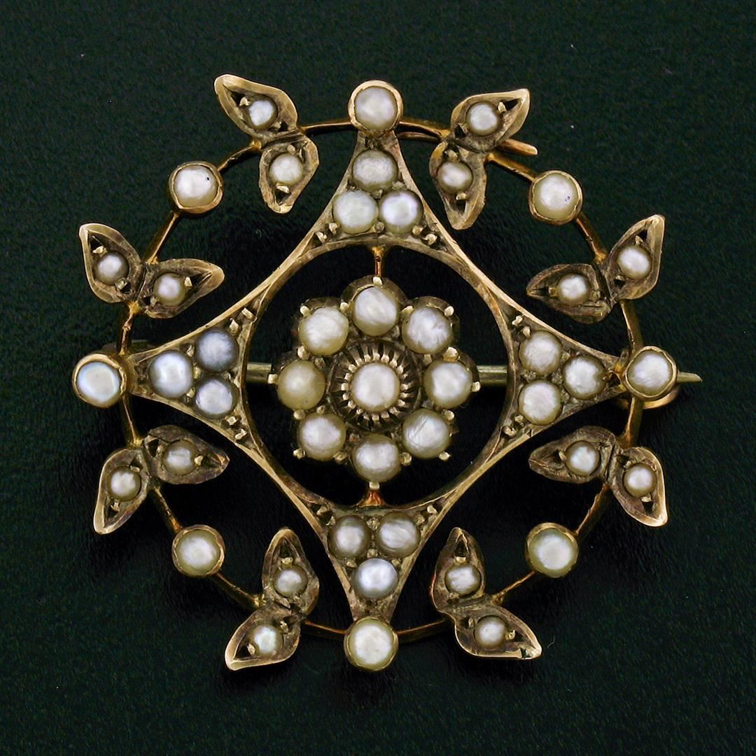 An antique solid 14k yellow gold open round pin brooch, with 43 round shape natural seed pearls (1.35-2.25mm). Measures 29.50mm in diameter and weighs a total of 4.0 grams.