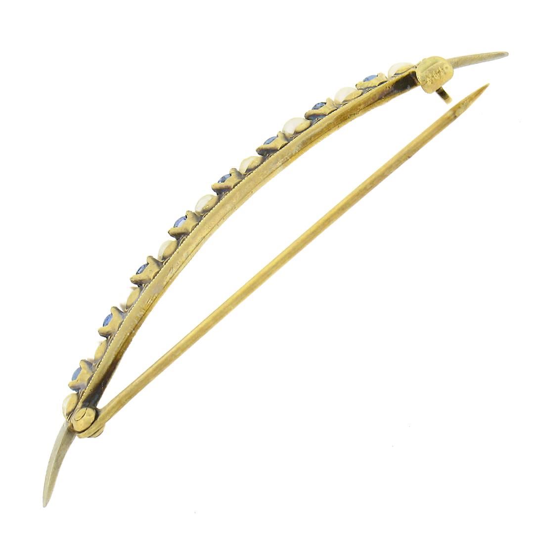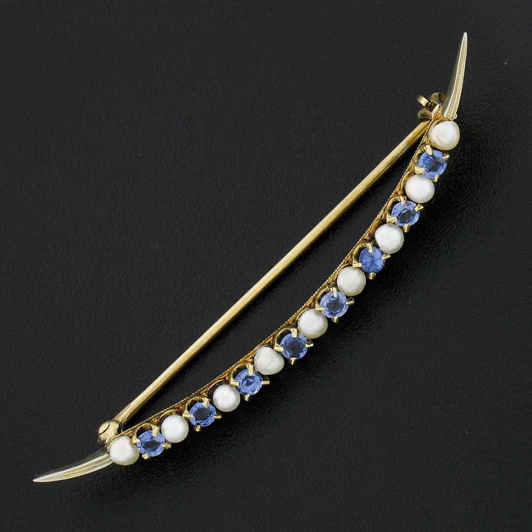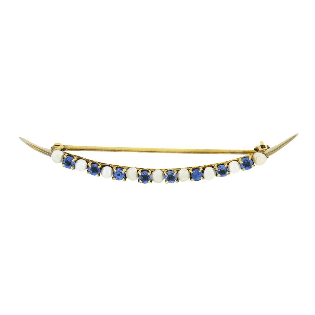 An antique solid 14k yellow gold crescent brooch, with 9 round & baroque shape cultured seed pearls (2.5mm to 2.8mm), and 8 old round cut natural sapphires (0.40ctw). Measures 56.7x3mm and weighs a total of 3.81 grams.