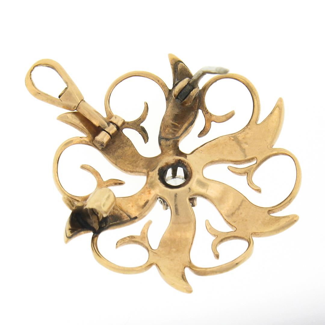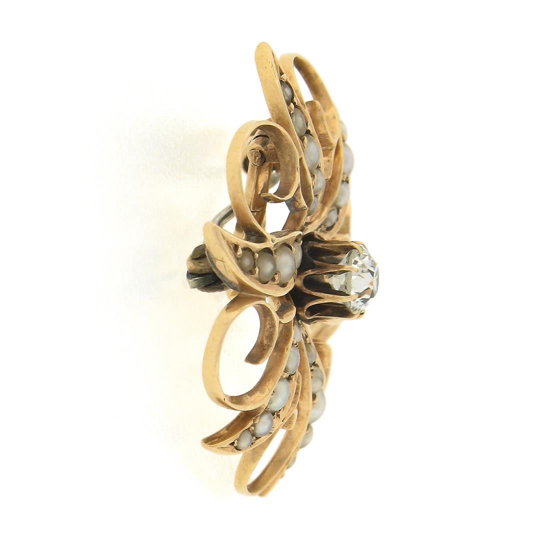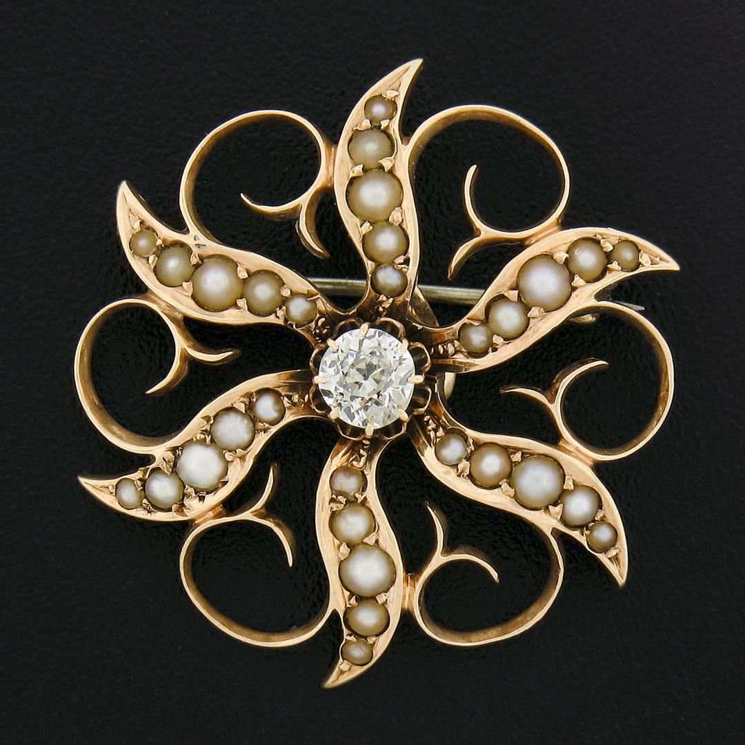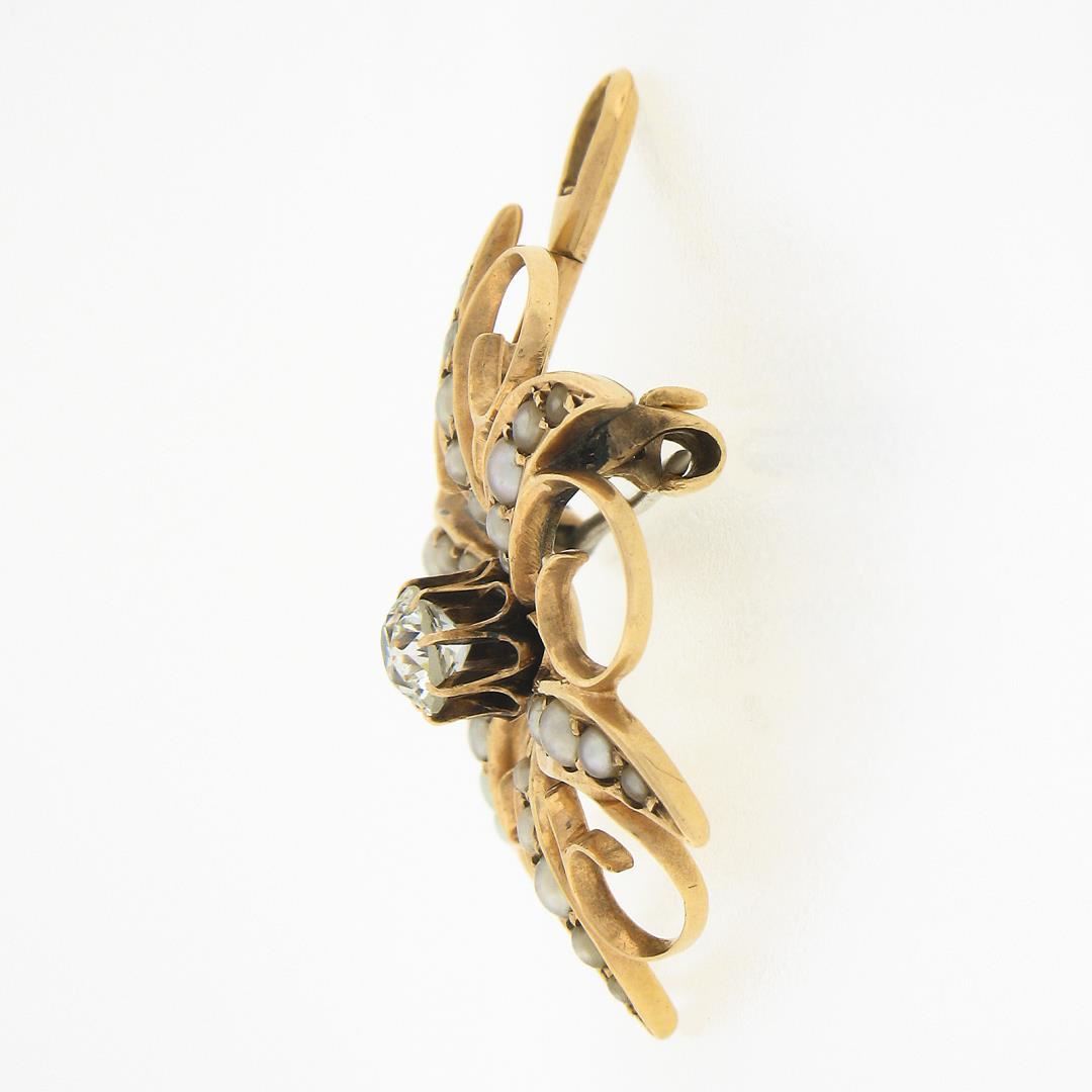 An antique solid 14k yellow gold brooch pendant, with 1 old mine cut natural diamond (G/H - VS2 ; 0.25ctw ),and numerous of round shape cultured seed pearls (1.3mm to 2.2mm each). Measures 31.7x25.5mm and weighs a total of 4.05 grams.