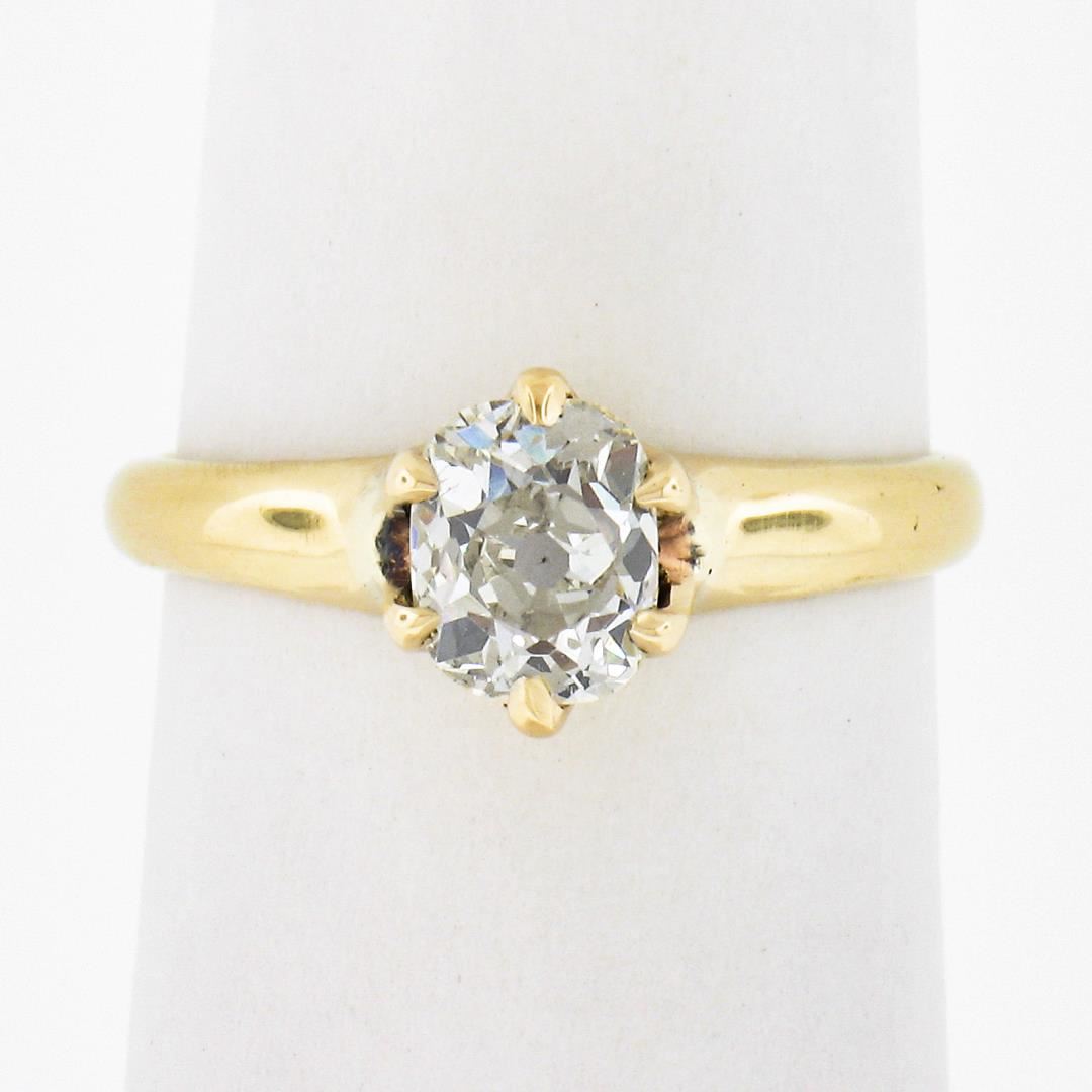 An antique solid 14k yellow gold solitaire engagement ring, with 1 old cushion cut natural diamond (K/L - I1 ; 0.82ct). The ring is size 5.0, weighs a total of 1.96 grams, and measures 7.2mm wide.