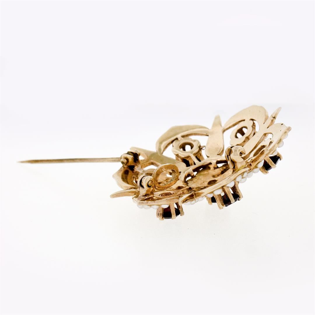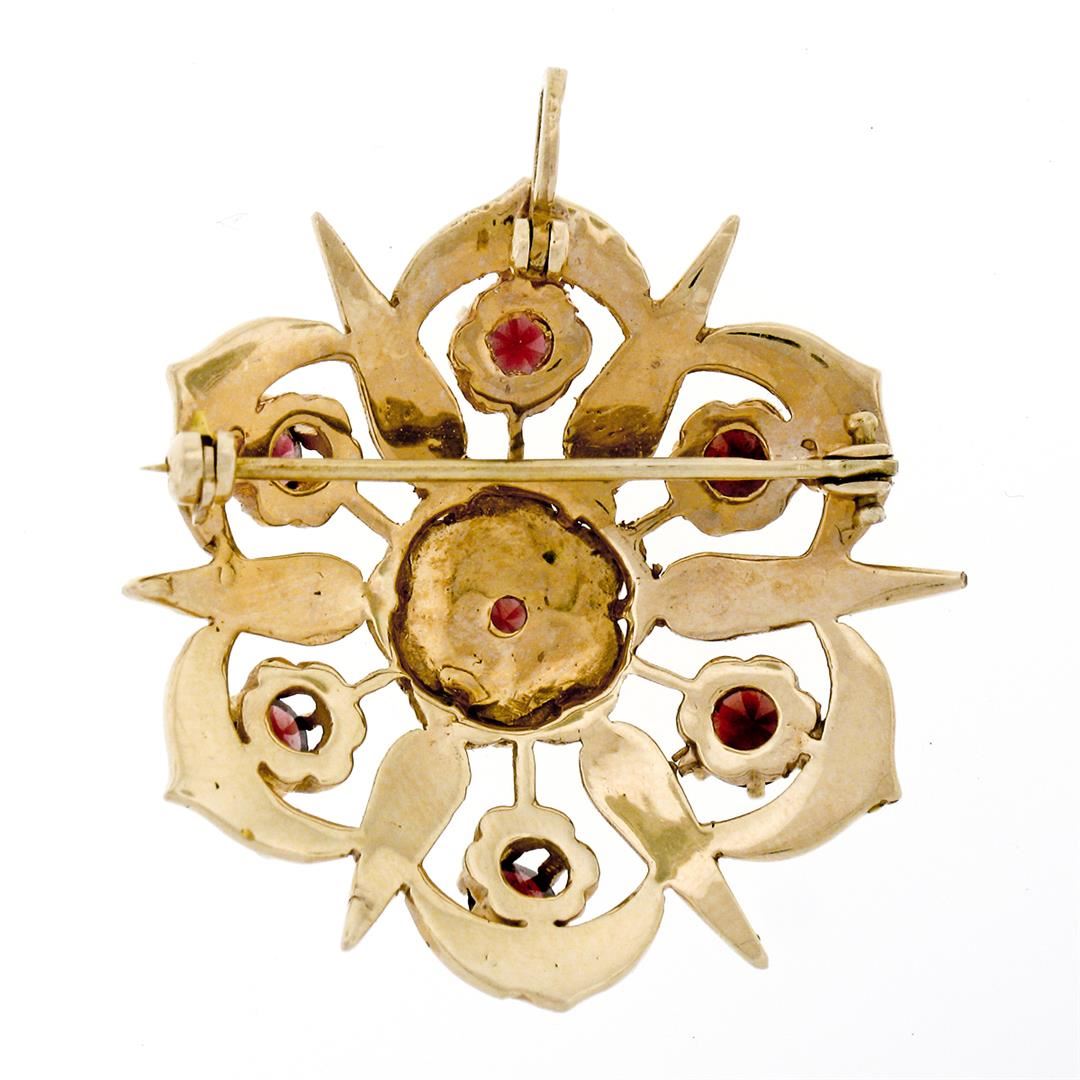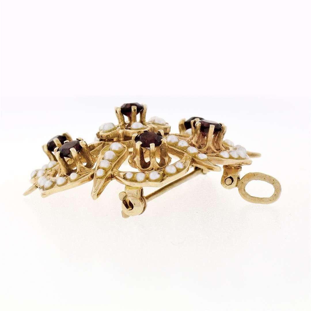 An antique solid 14k yellow gold floral brooch pendant, with 1 old cut natural garnet (1.50ctw), and 60 round shape natural seed pearls (1.50mm to 2.35mm). Measures 32.50x33mm and weighs a total of 8.55 grams.