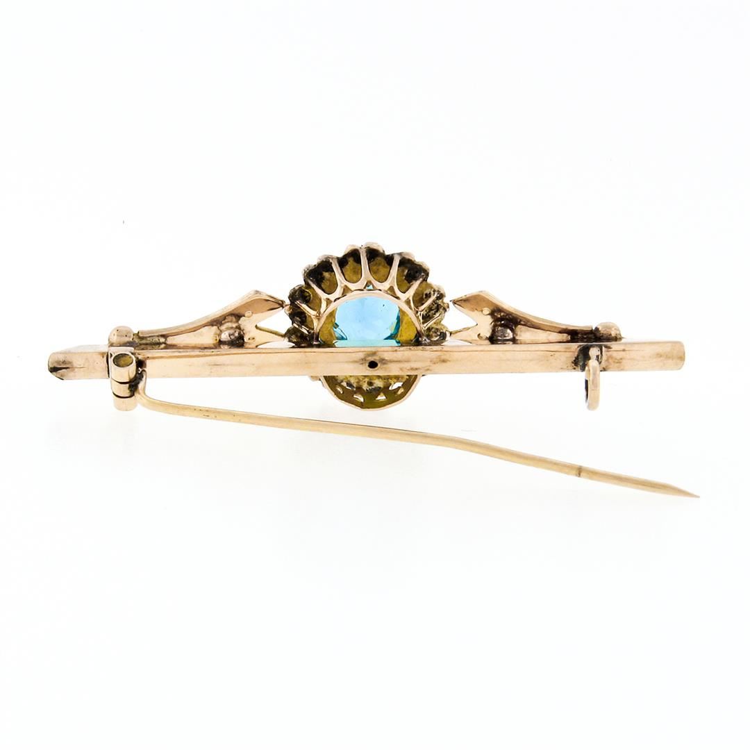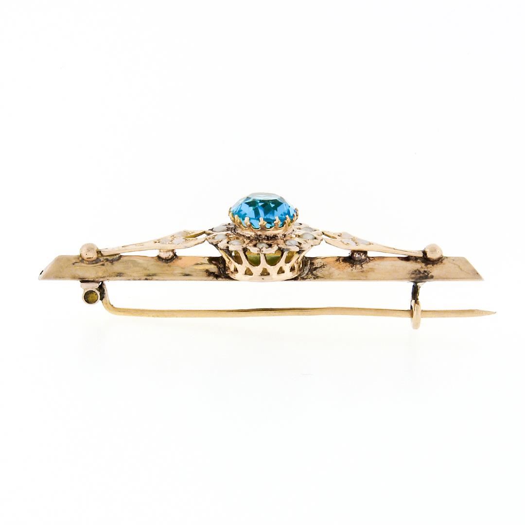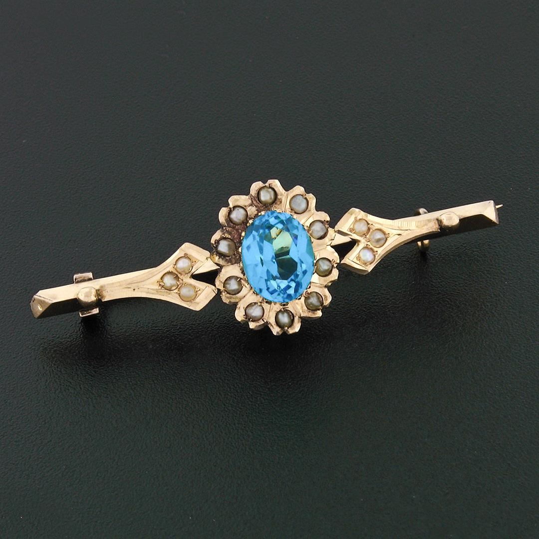 An antique victorian solid 14k yellow gold bar pin brooch, with 1 oval cut synthetic blue stone ( 9.15x7.20mm), and 16 round shape genuine seed pearls (1.80-2.10mm). Measures 48.70x15.60mm and weighs a total of 3.96 grams.