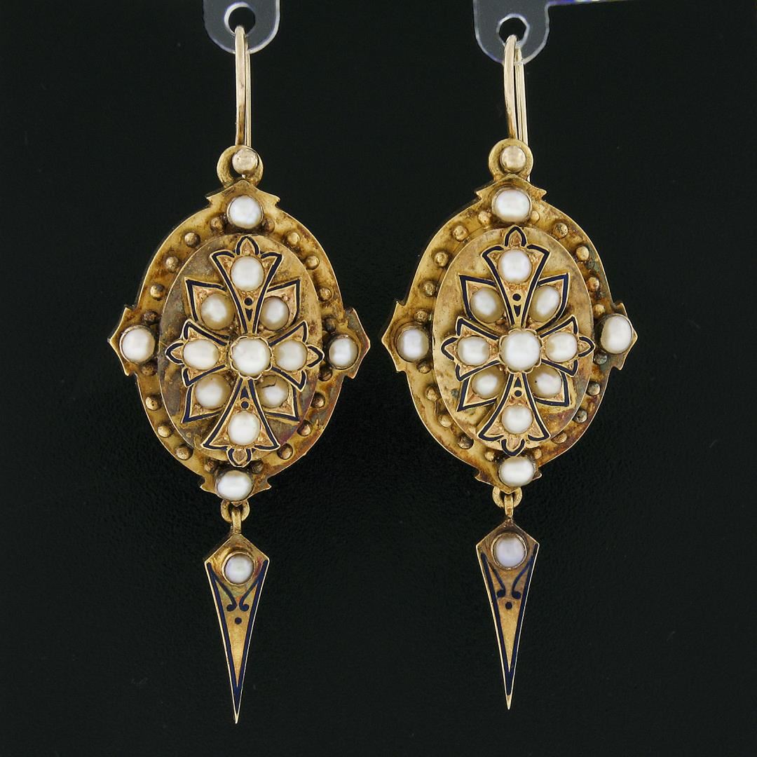 An antique solid 14k yellow gold dangle earrings, with 28 cultured seed pearls (2.5mm to 3.0mm each). The earrings measure approximately 51.7x20.2mm and weigh a total of 14.33 grams.
