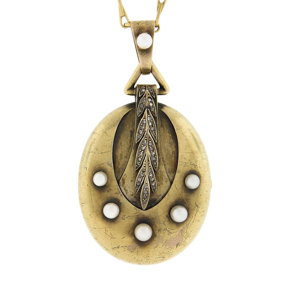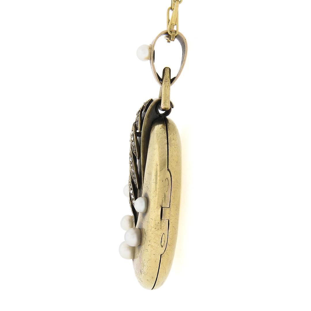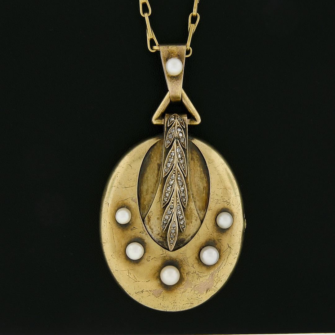 An antique solid 14k yellow gold locket pendnat necklace, with 41 rose cut natural diamonds (H-J - SI1-I2 ; 0.25ct ), and 6 round shape cultured pearls (3.6-4.6mm). 17 inch fancy link chain, 35.33 grams total weight, pendant measures 63x34.7mm.