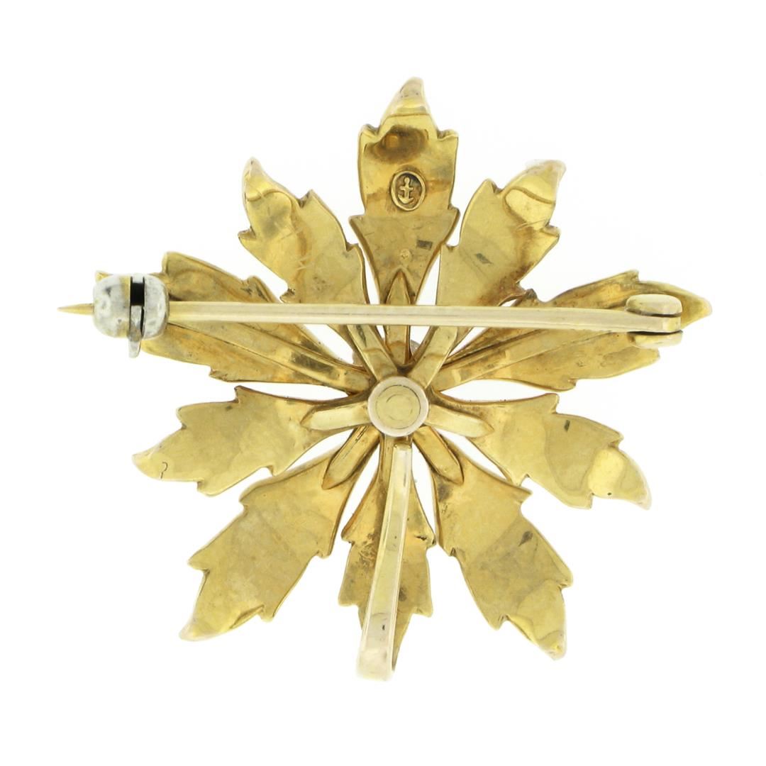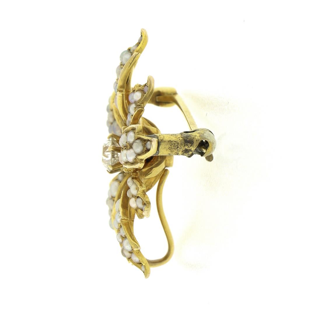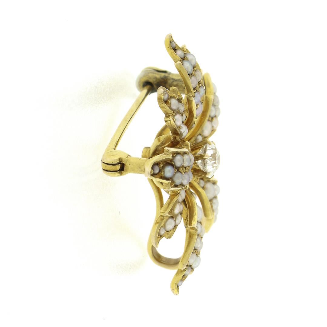 An antique solid 14k yellow gold brooch pendant, with 1 old European cut natural diamond (H - SI1 ; 0.25ctw ), and 90 round shape cultured seed pearls (1mm to 2.2mm each). Measures 26.7x27.3mm and weighs a total of 4.87 grams.