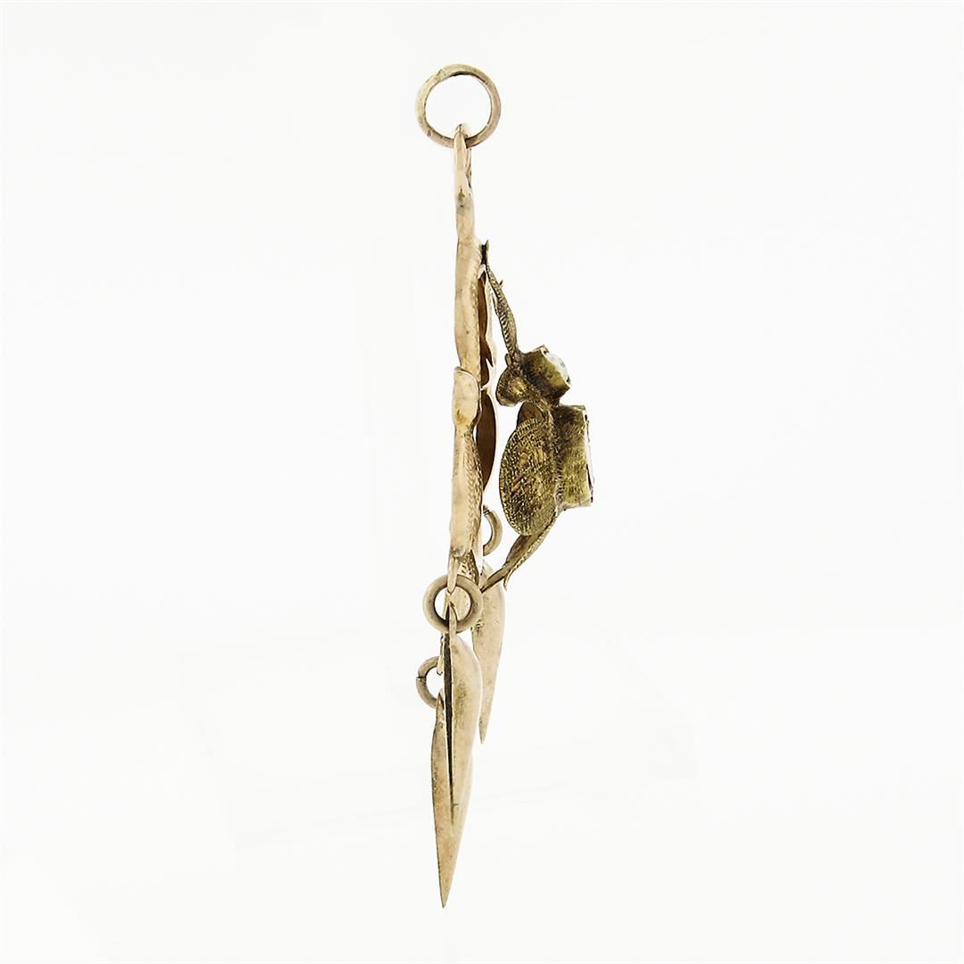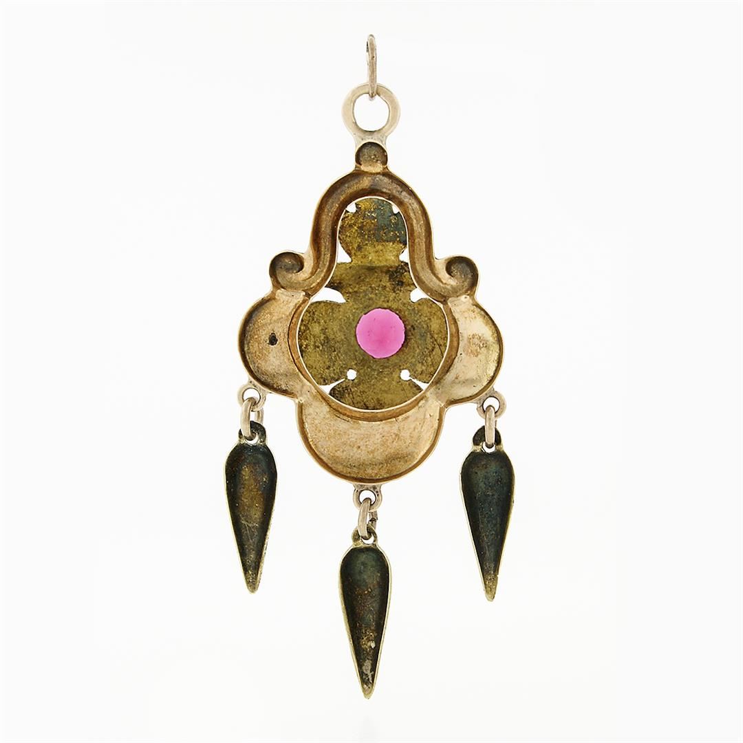 An anrtique victorian solid 14k yellow gold tassel dangle pendant, with 1 round cut red stone (5.7mm), and 1 round shape cultured pearl (2.25mm). The pendant weighs a total of 2.35 grams, measures 54.95x23.5mm including the bail, and the inside of the bail measures 3.85mm.