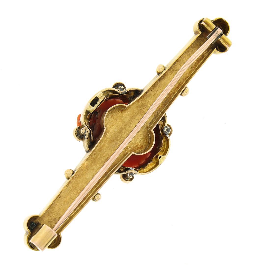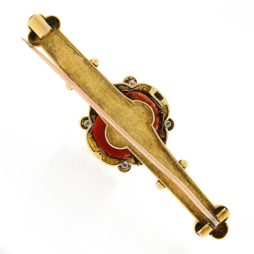 An antique solid 14k yellow gold bar brooch, with 1 GIA graded carved oval shape natural coral (17.05x13.52mm), and 4 round shape cultured seed pearls (2.4mm each). Measures 21x66.4mm and weighs a total of 9.98 grams. Comes with all original relevant certifications.