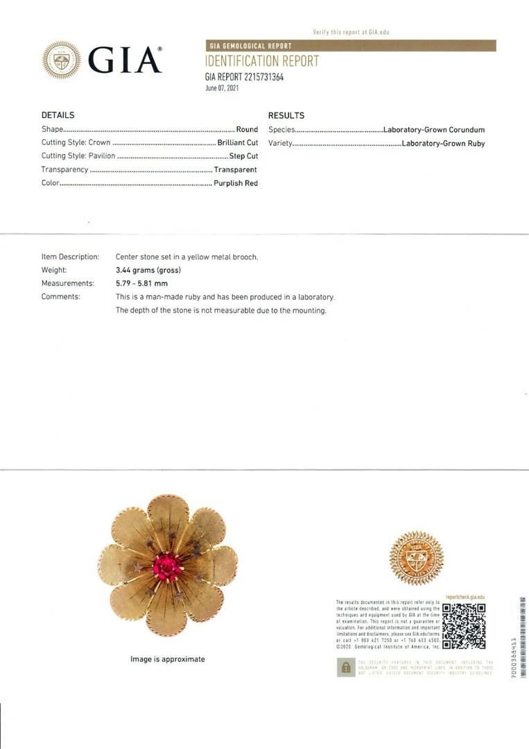 An antique solid 14k yellow gold flower pin brooch, with 1 Gia certified old round cut lab grown ruby (3.44 grams), and Measures 29mm in diameter and weighs a total of 3.44 grams. Comes with all original relevant certifications.