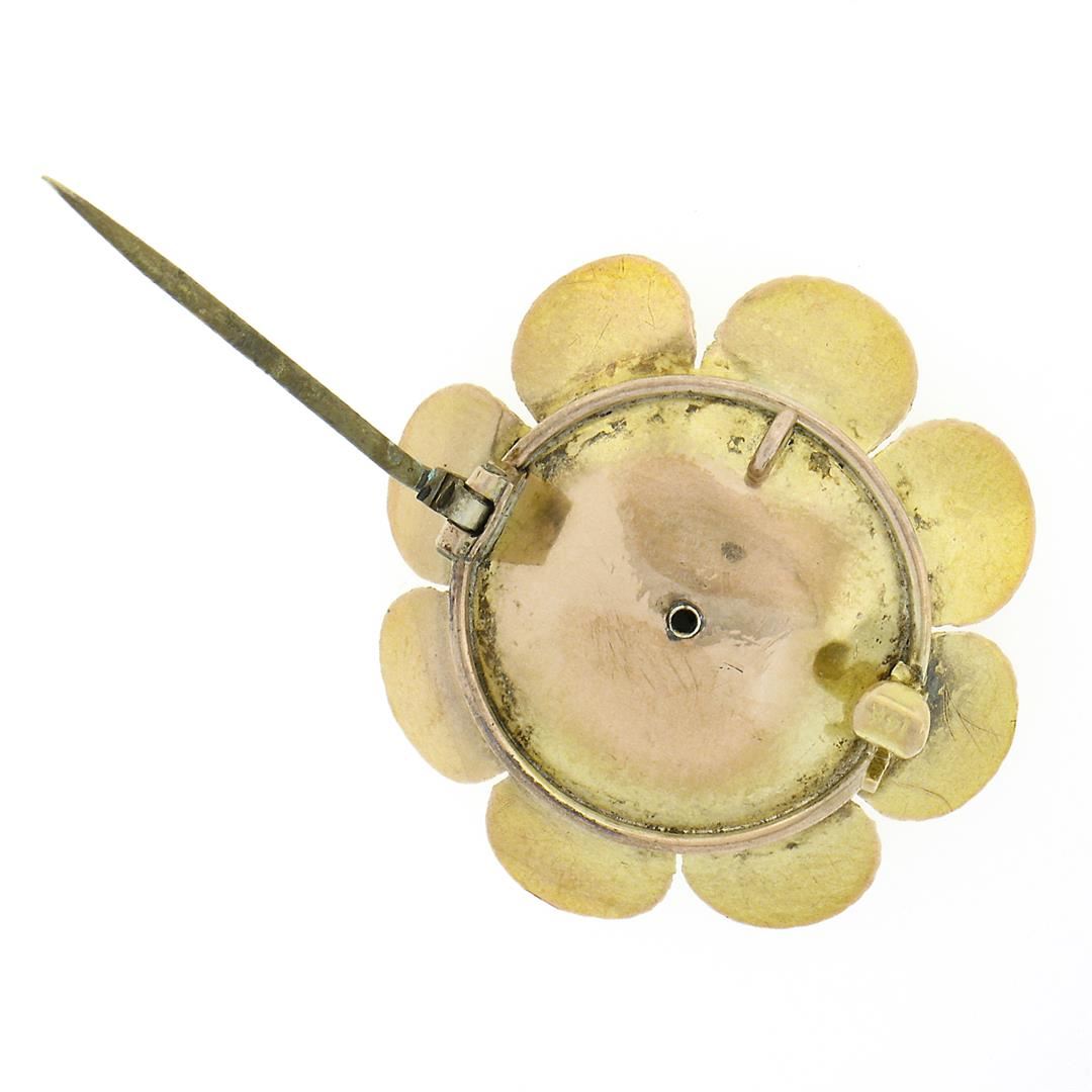 An antique solid 14k yellow gold flower pin brooch, with 1 Gia certified old round cut lab grown ruby (3.44 grams), and Measures 29mm in diameter and weighs a total of 3.44 grams. Comes with all original relevant certifications.