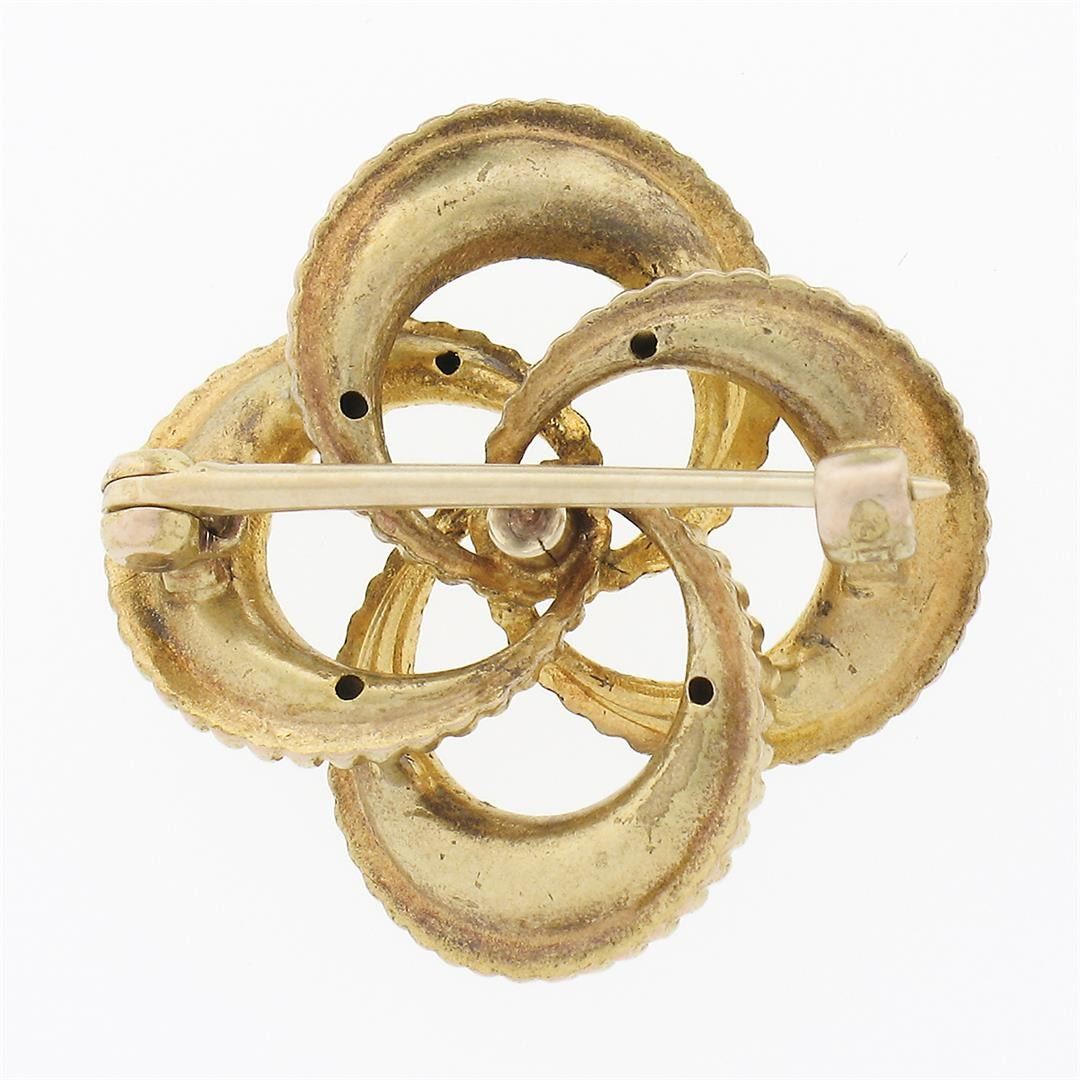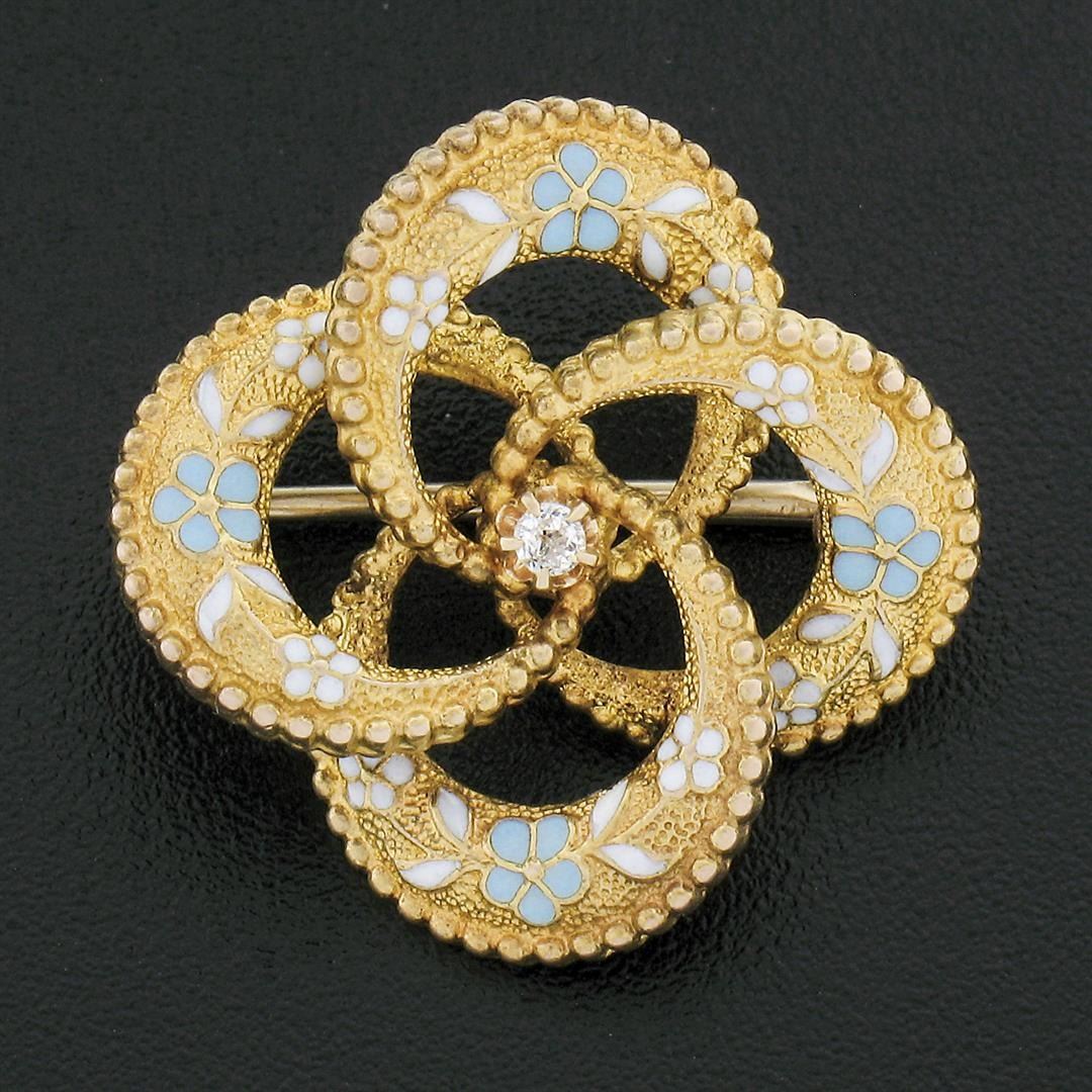 An antique victorian solid 14k yellow gold knot pin brooch, with enamel work & 1 old mine cut natural diamond (G - VS2 ; 0.04ct). Measures 22.45x22.45mm and weighs a total of 3.11 grams.