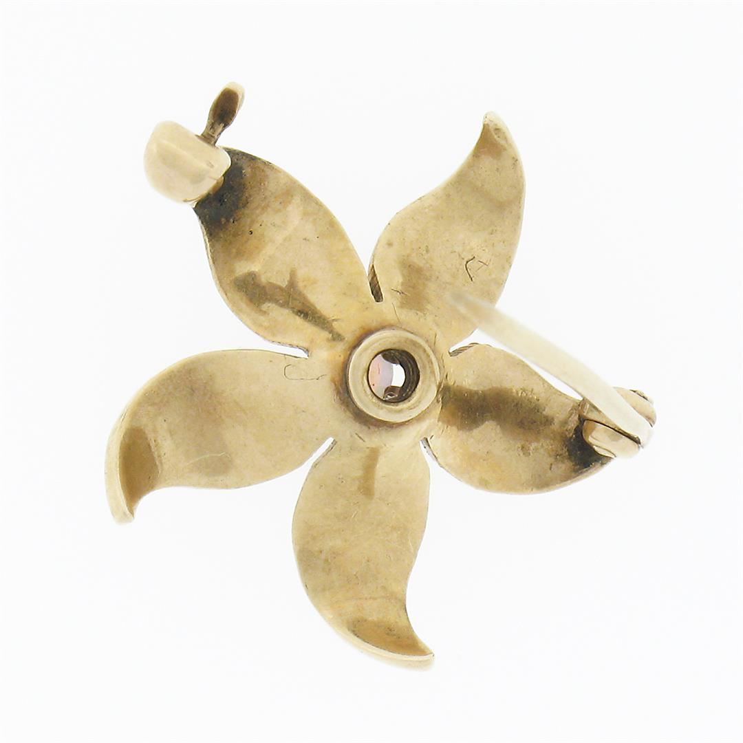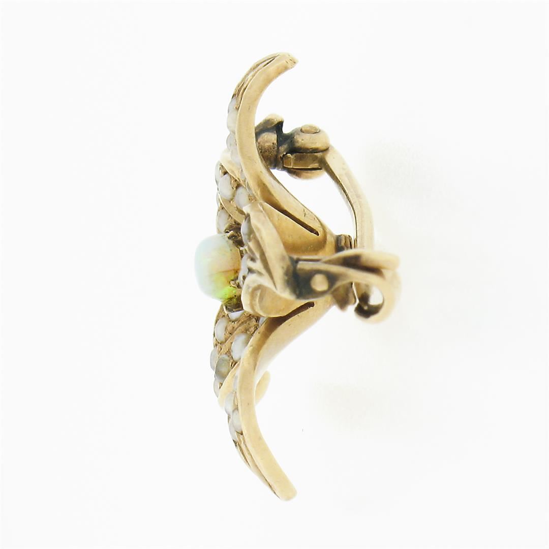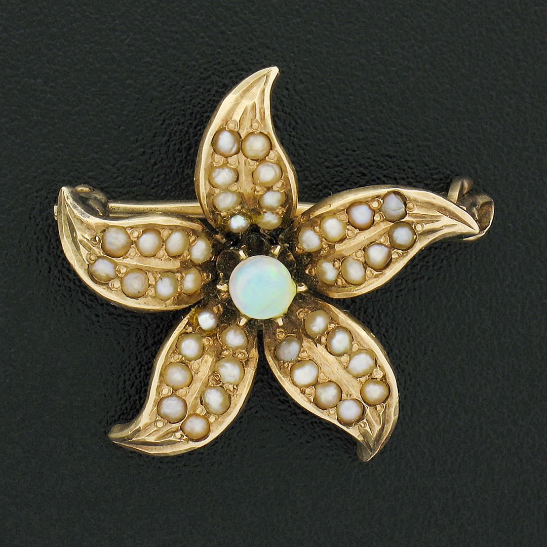 An antique solid 14k yellow gold lily flower pin brooch, with 1 round cabochon cut natural opal (3.30mm), and 40 round shape cultured seed pearls (1.1mm each). Measures 20.15x21.30mm and weighs a total of 2.60 grams.
