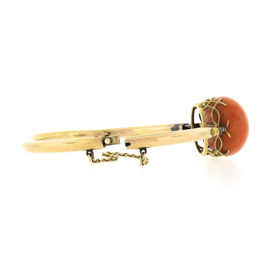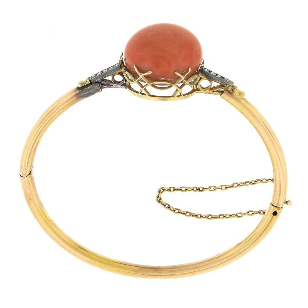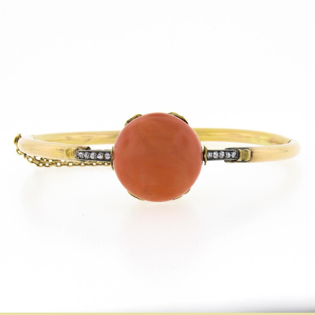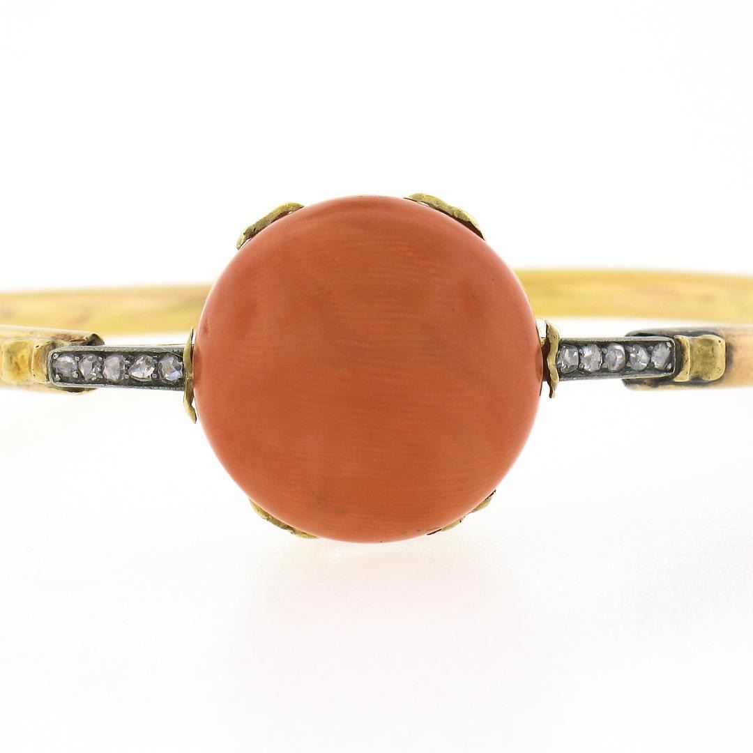 An antique solid 14k yellow gold & silver bangle bracelet, with 1 round shape genuine coral (18.2mm ), and 10 rose cut natural diamonds (G/H - SI1/SI2 ; 0.15ctw). It weighs a total of 19.46 grams, measures 34mm wide, and measures 6.25 inches in length.
