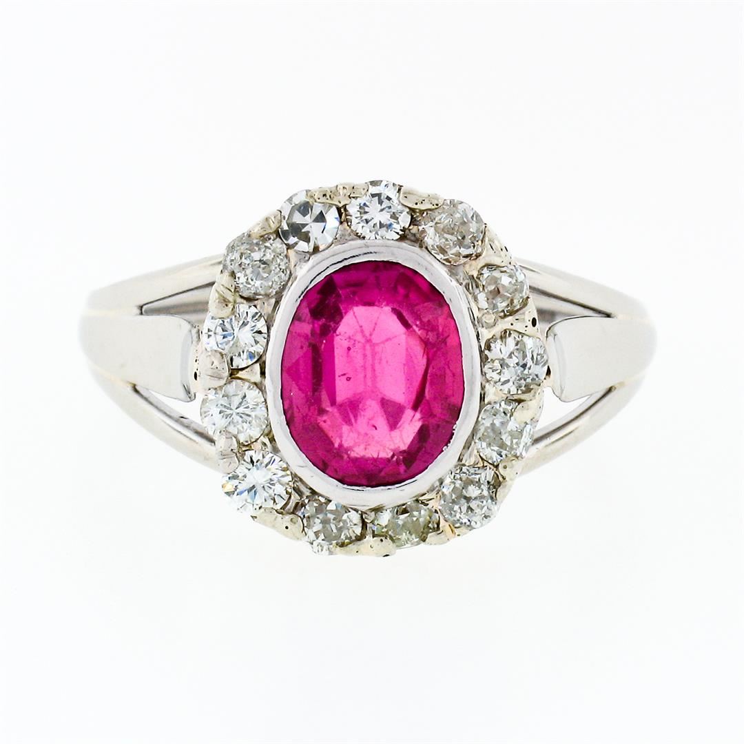 A Victorian era solid two tone 14k gold ring with 1 oval cut red stone (7.30x5.80mm) and halo of 18 round cut natural diamonds (H/I - VS1 to SI1; 0.50ctw). The ring is size 6.0, weighs a total of 3.55 grams, and measures 12.19mm wide.