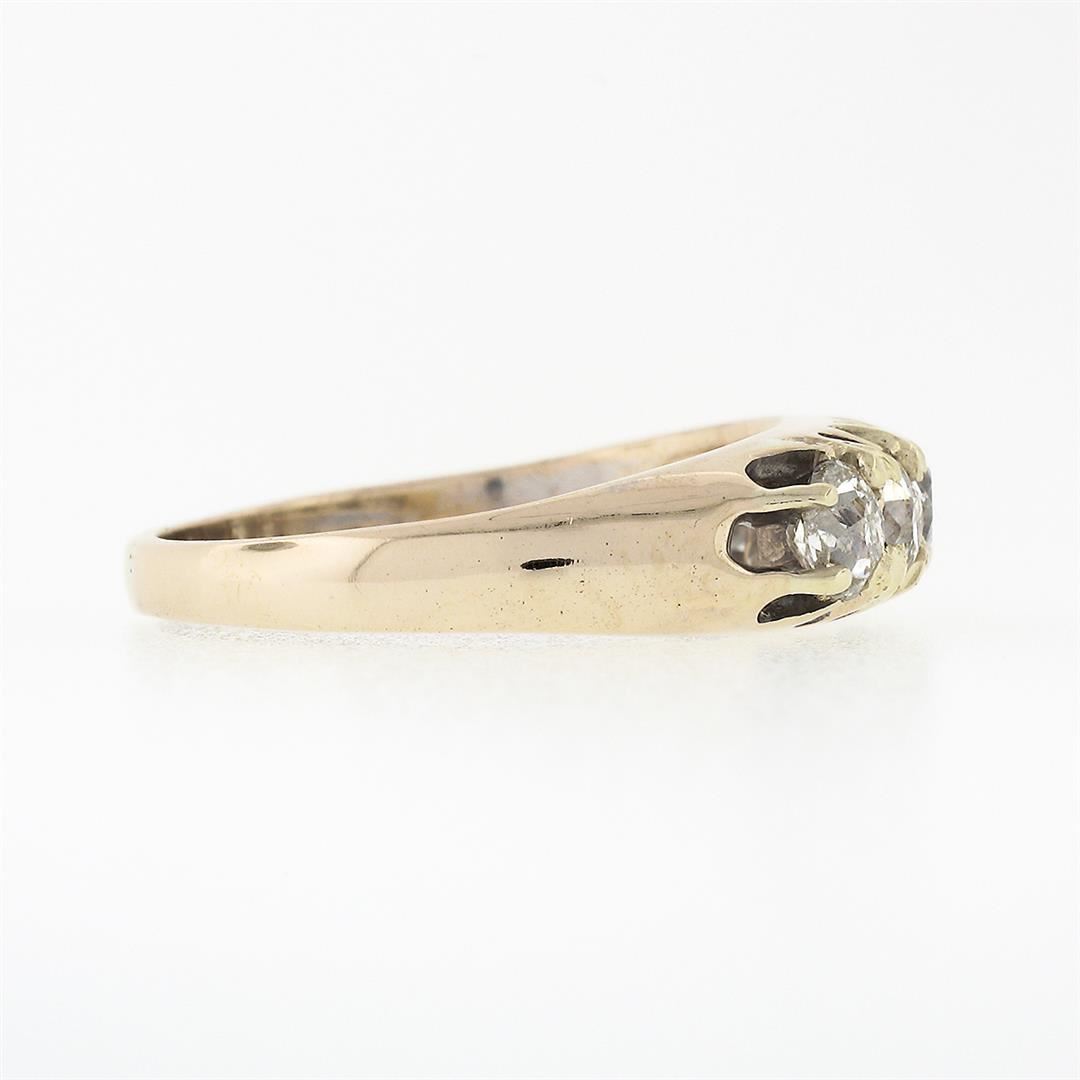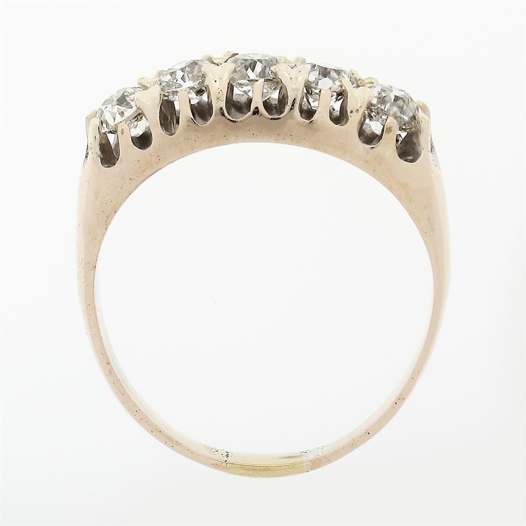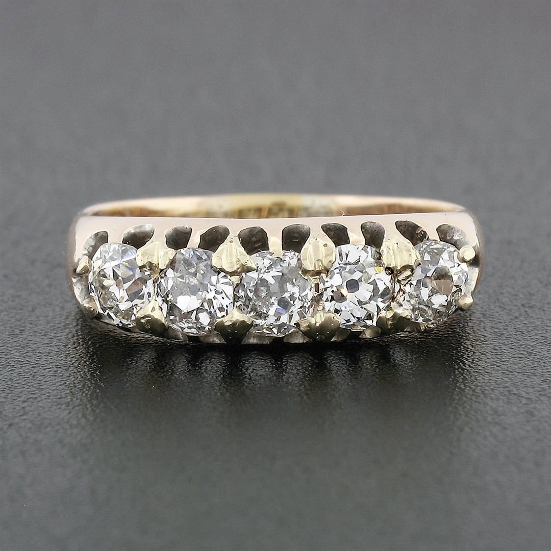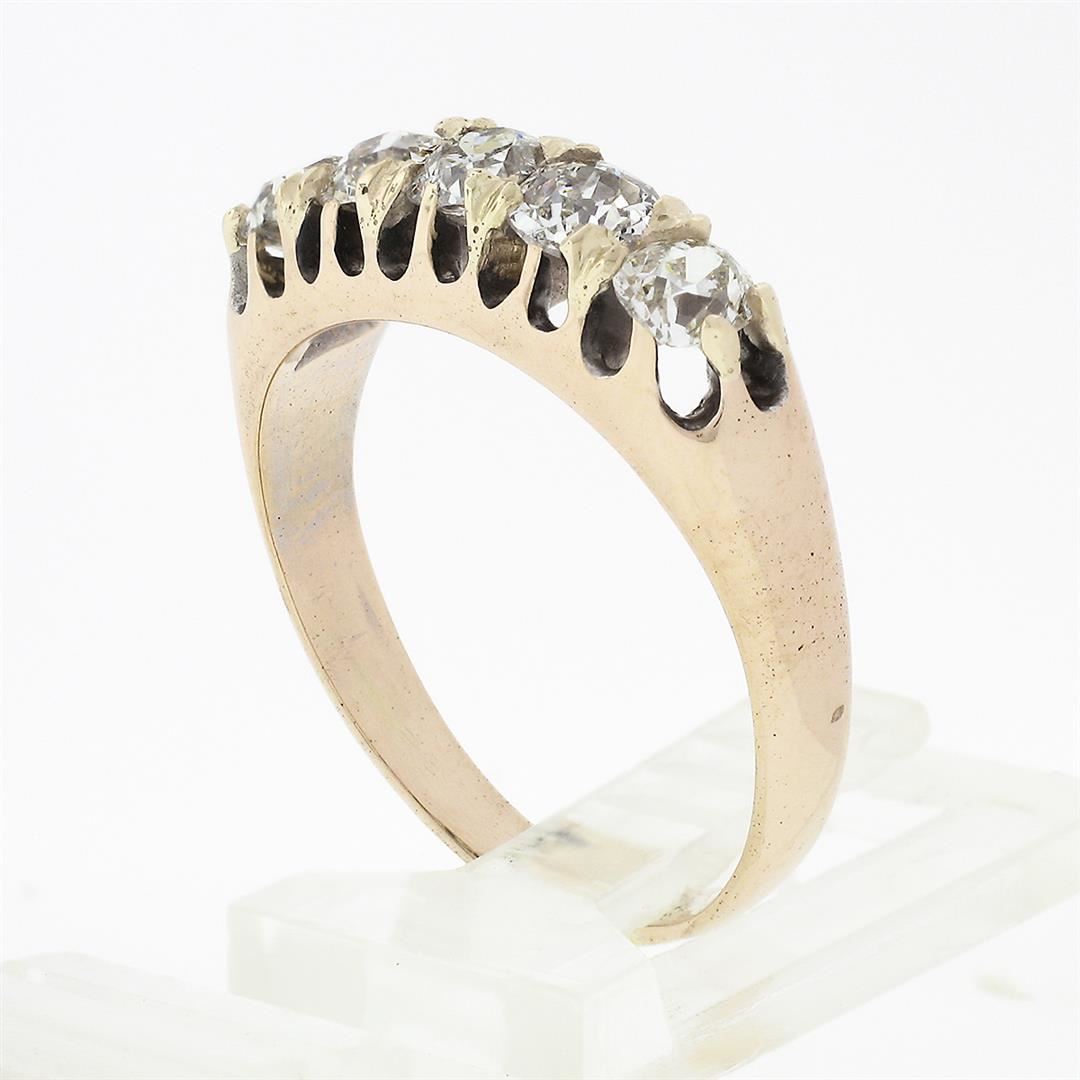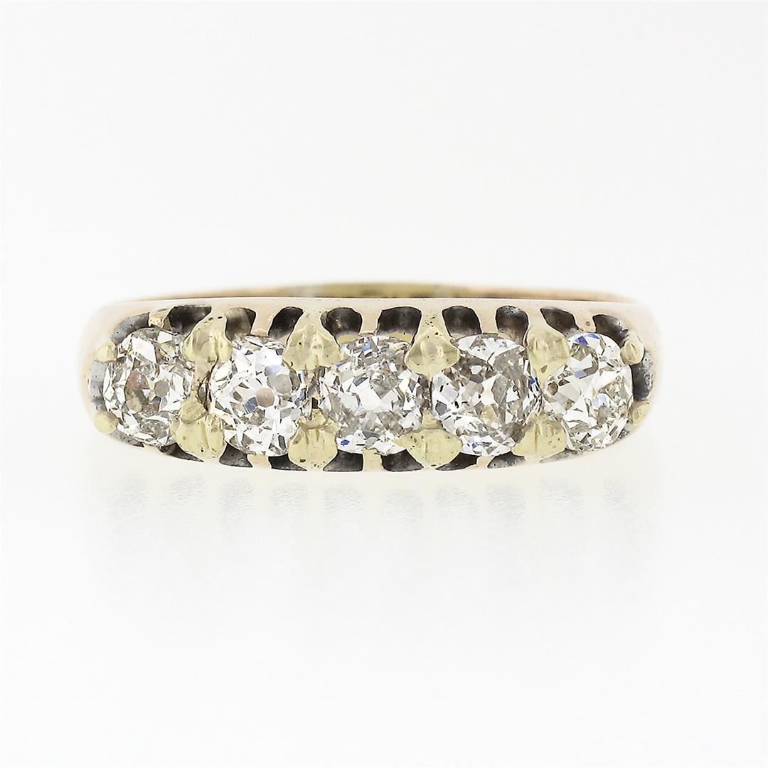 An antique victorian solid 14k rosy yellow gold band ring, featuring 5 old mine cut natural diamonds (G/H - VS1/VS2 ; 1.35ctw). The ring is size 8.25, weighs a total of 4.0 grams, and measures 6.0mm wide.