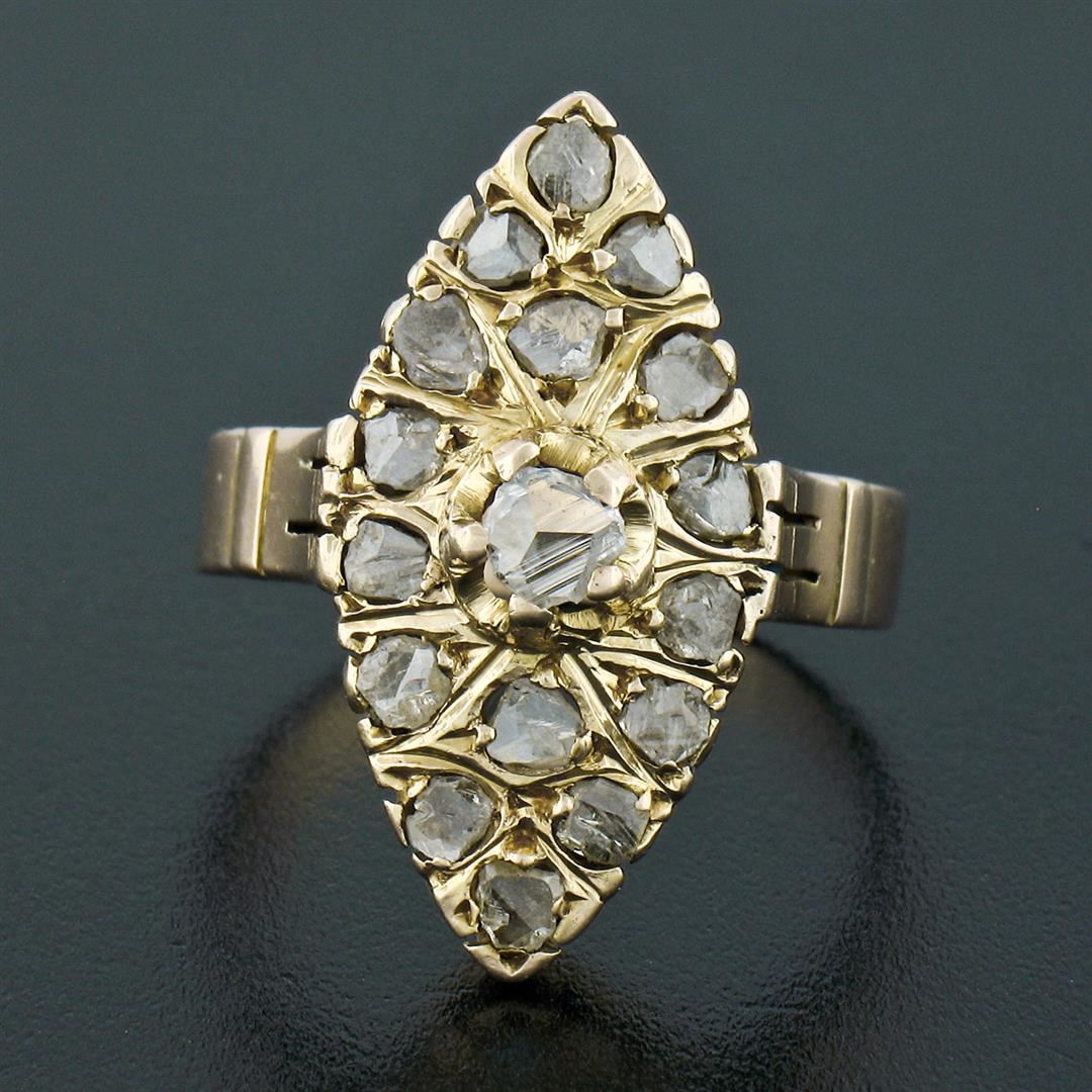 An antique solid 14k yellow gold navette ring, with 17 rose cut natural diamonds (1.40ctw). The ring is size 8.0, weighs a total of 4.78 grams, and measures 23.75mm wide.