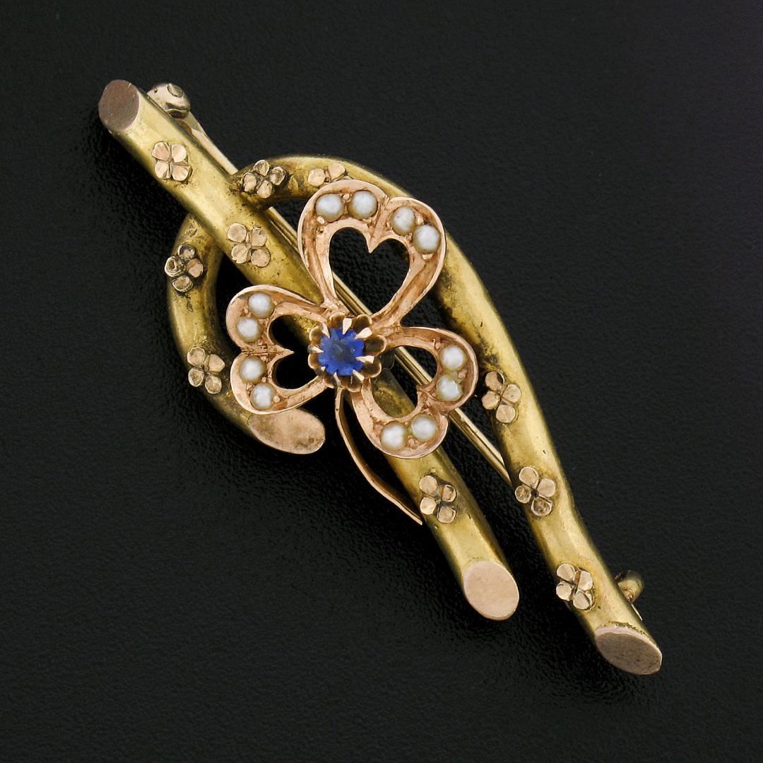 An antique solid 14k yellow and white gold brooch, with 12 round shape cultured seed pearls (1.4mm each), and 1 old mine cushion cut natural sapphire (0.08ctw ). Measures 17.60x45.30mm and weighs a total of 3.27 grams.