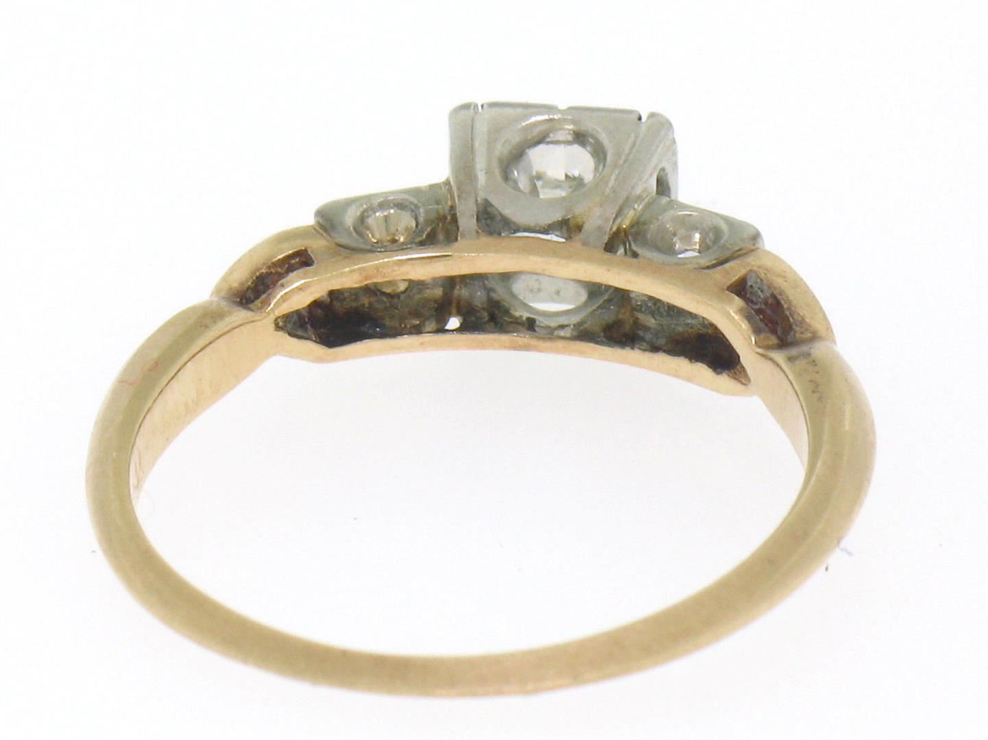 An antique victorian solid 14k white and yellow gold 3 stones ring, featuring 3 cushion old cut natural diamonds (H/I - VS2; 0.40ctw). The ring is size 5.5, weighs a total of 2.3 grams, and measures 5.88mm wide.