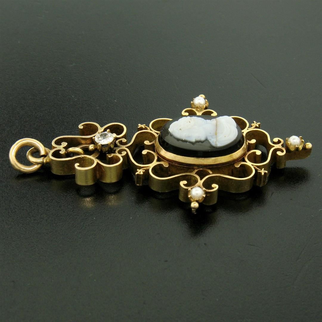 An excellent condition antique 14k yellow gold locket pendant with a oval carved white and black stone cameo, 2.6mm seed pearls, and a 0.20ct old mine cut diamond (I - VS2). The pendant weighs a total of 16.2 grams and measures 65.2x37.5mm.