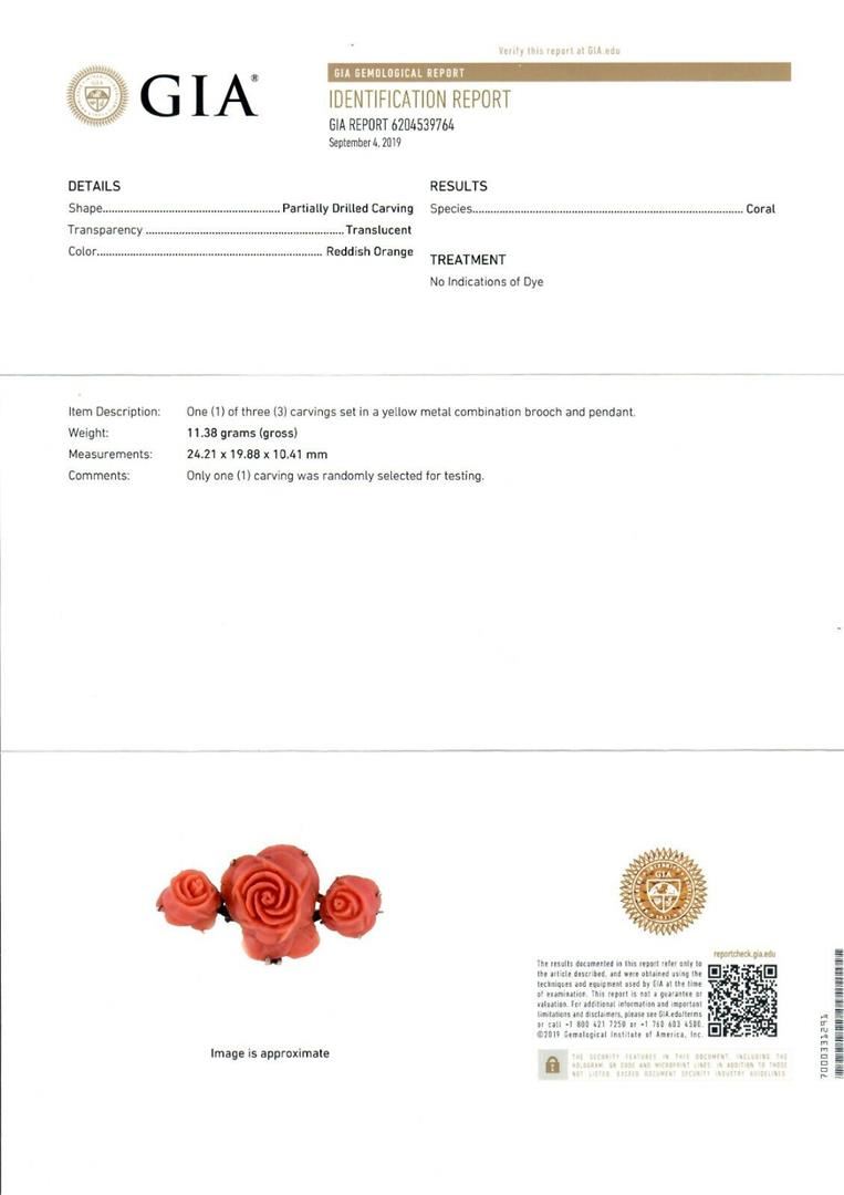 An antique victorian solid 14k yellow gold bar pin brooch pendant, featuring 3 carved roses natural corals, 1 was Gia certified (24.21 x 19.88 x 10.41 mm). Measures 24.31x44.88mm and weighs a total of 11.38 grams. Comes with all original relevant certifications.