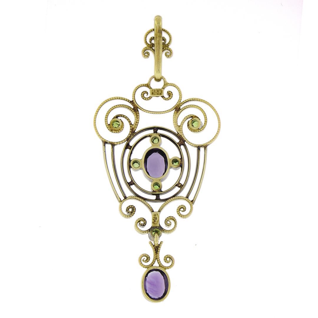 An antique solid 15k yellow gold lavalier pendant, with 2 oval cut natural amethysts (5.7x4mm & 5.5x3.8mm), and 7 round cut demantoid garnets (0.10-0.15ctw). The pendant weighs a total of 4.77 grams, measures 49.2x22.3mm including the bail, and the inside of the bail measures 9.7x3mm.