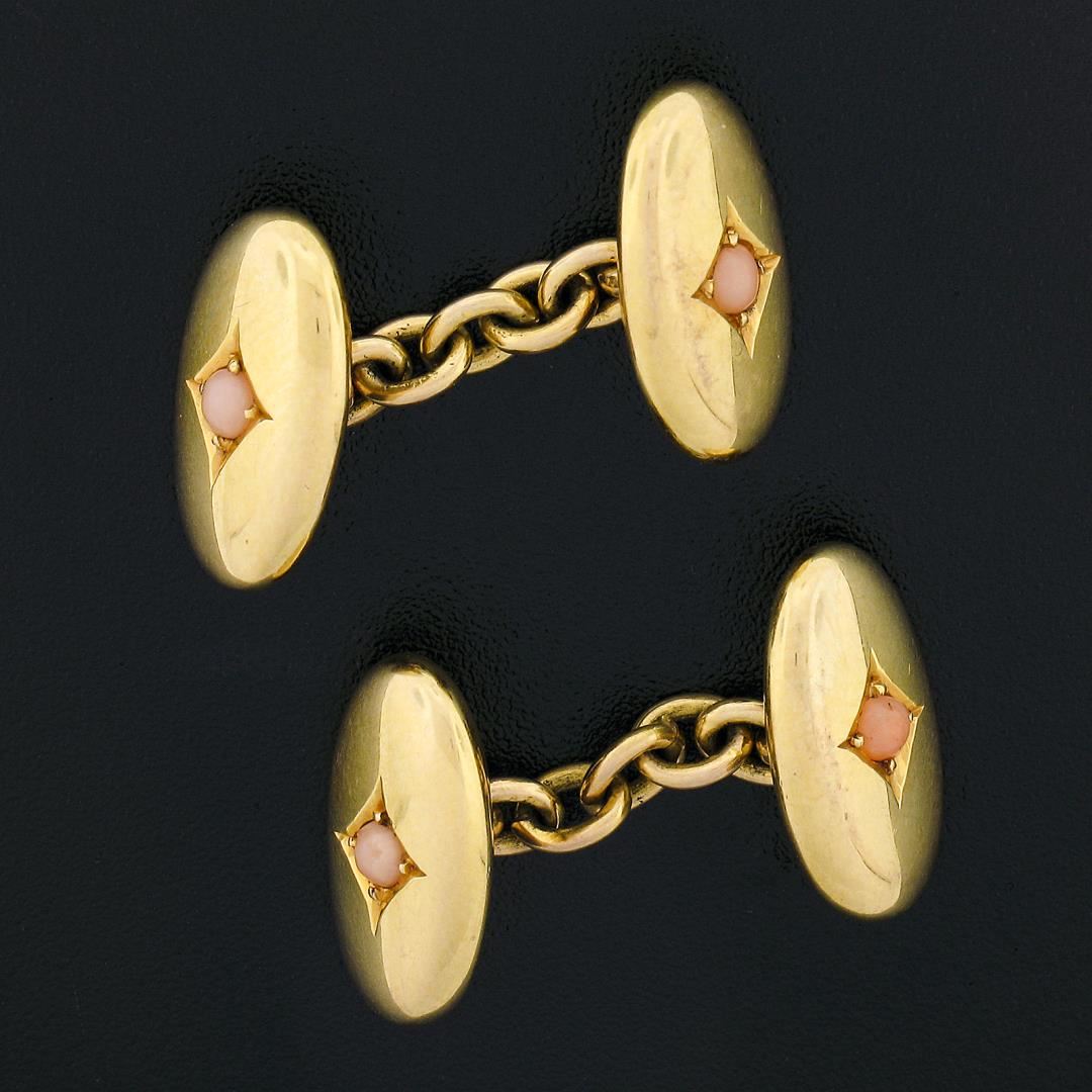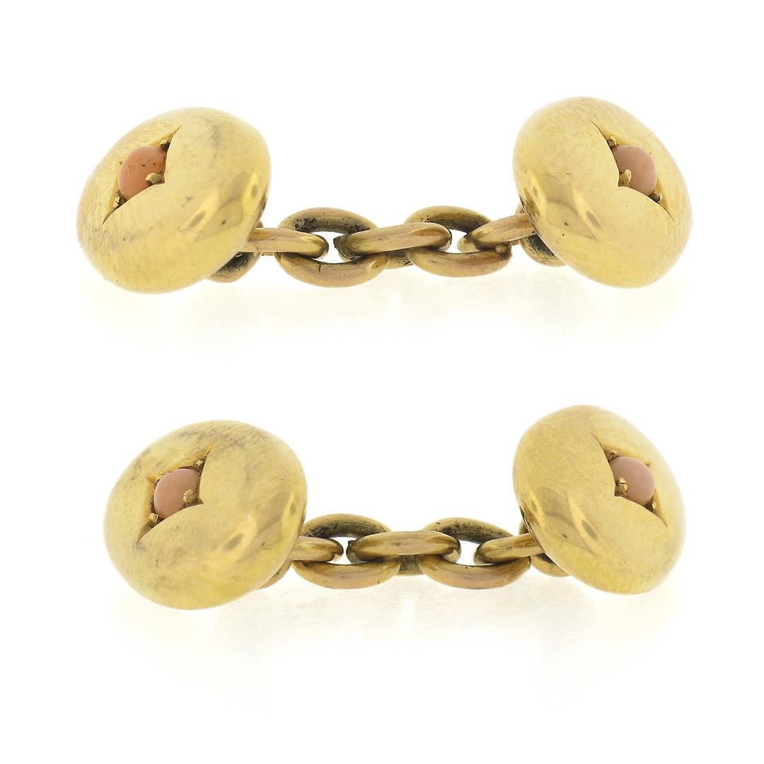 An antique solid 15k yellow gold cufflinks, with 4 round shape natural corals (2.3mm each). These cuff links have a chain link design with a clearance of 16.8mm, weigh a total of 6.90 grams, and the front panels measure 15.2x8.7mm.