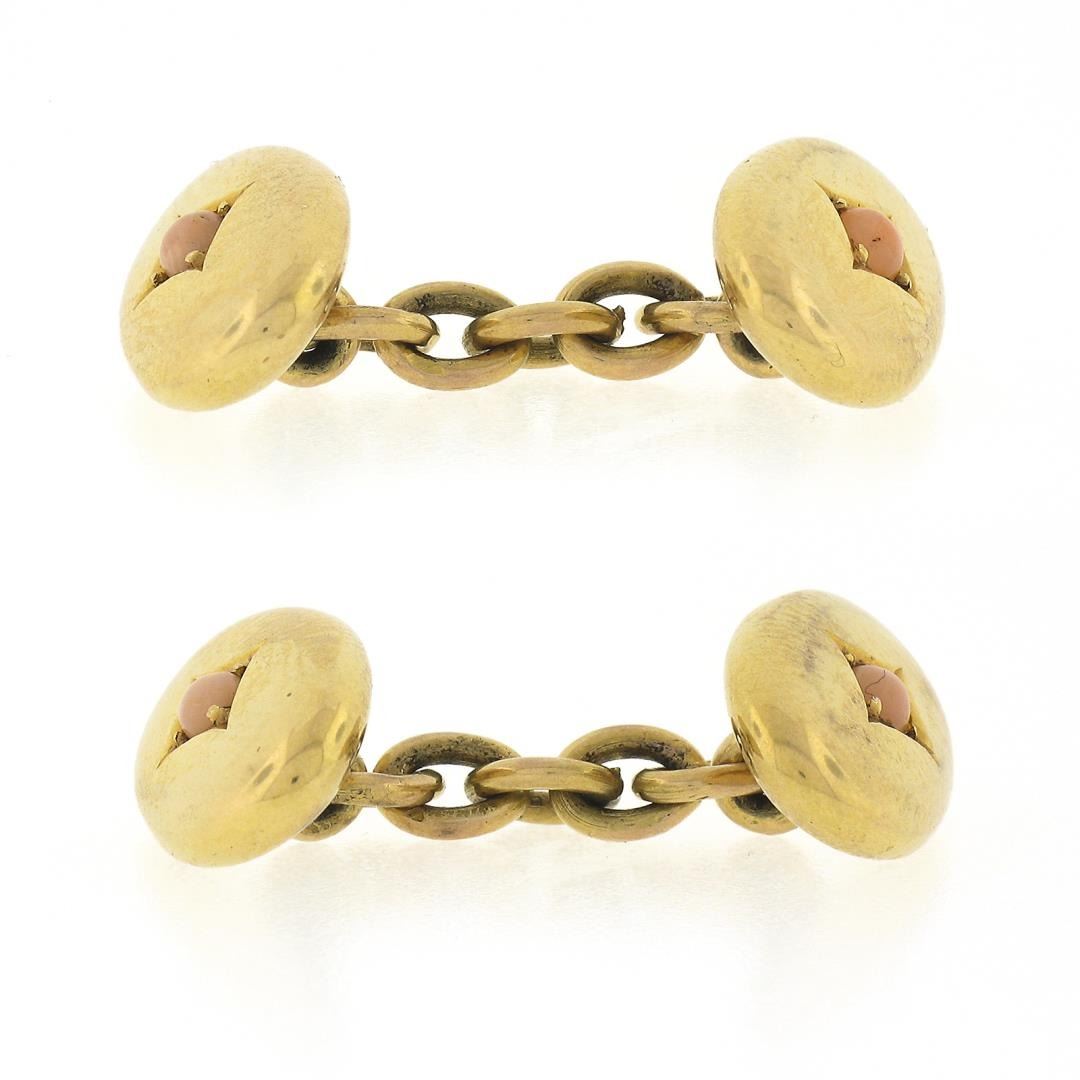 An antique solid 15k yellow gold cufflinks, with 4 round shape natural corals (2.3mm each). These cuff links have a chain link design with a clearance of 16.8mm, weigh a total of 6.90 grams, and the front panels measure 15.2x8.7mm.