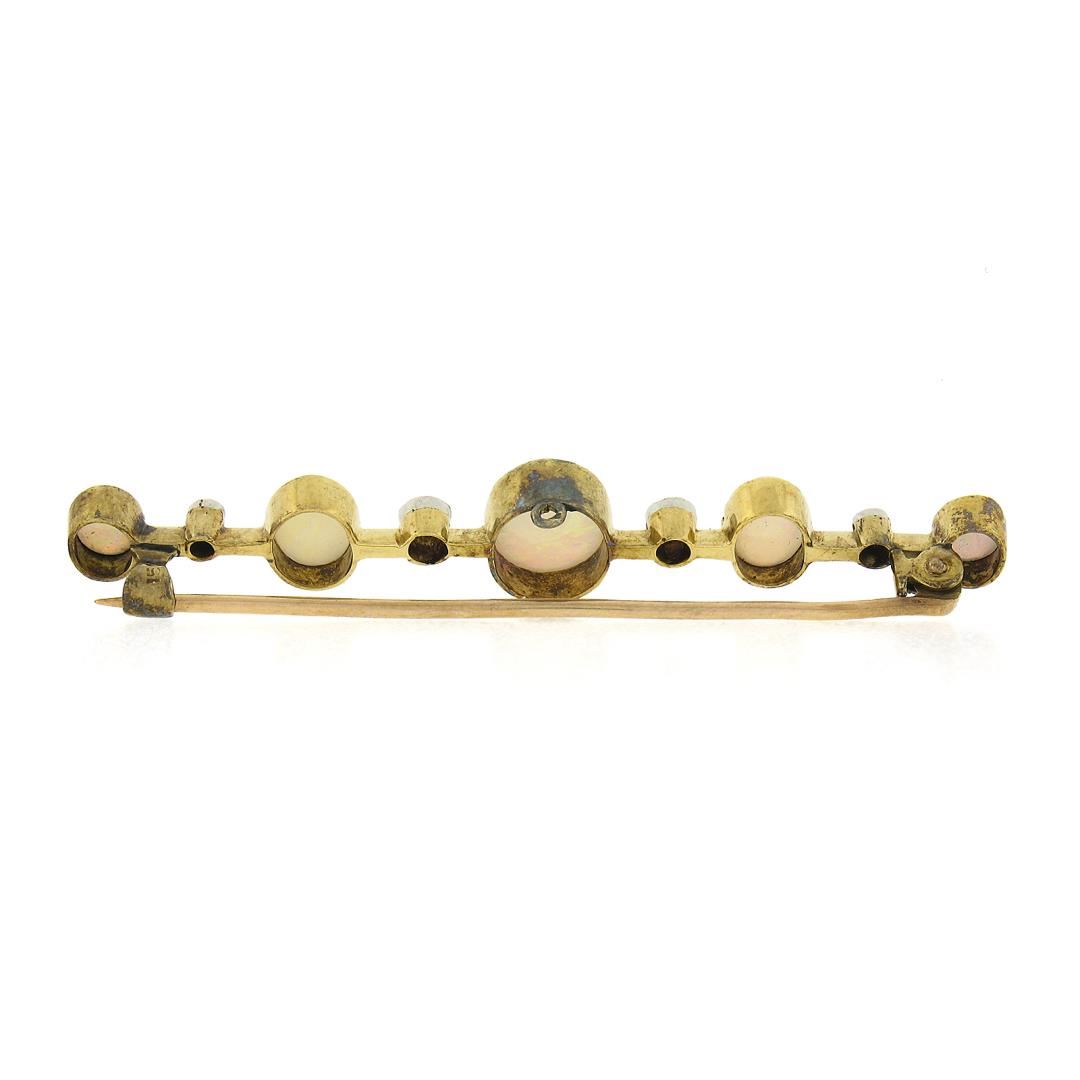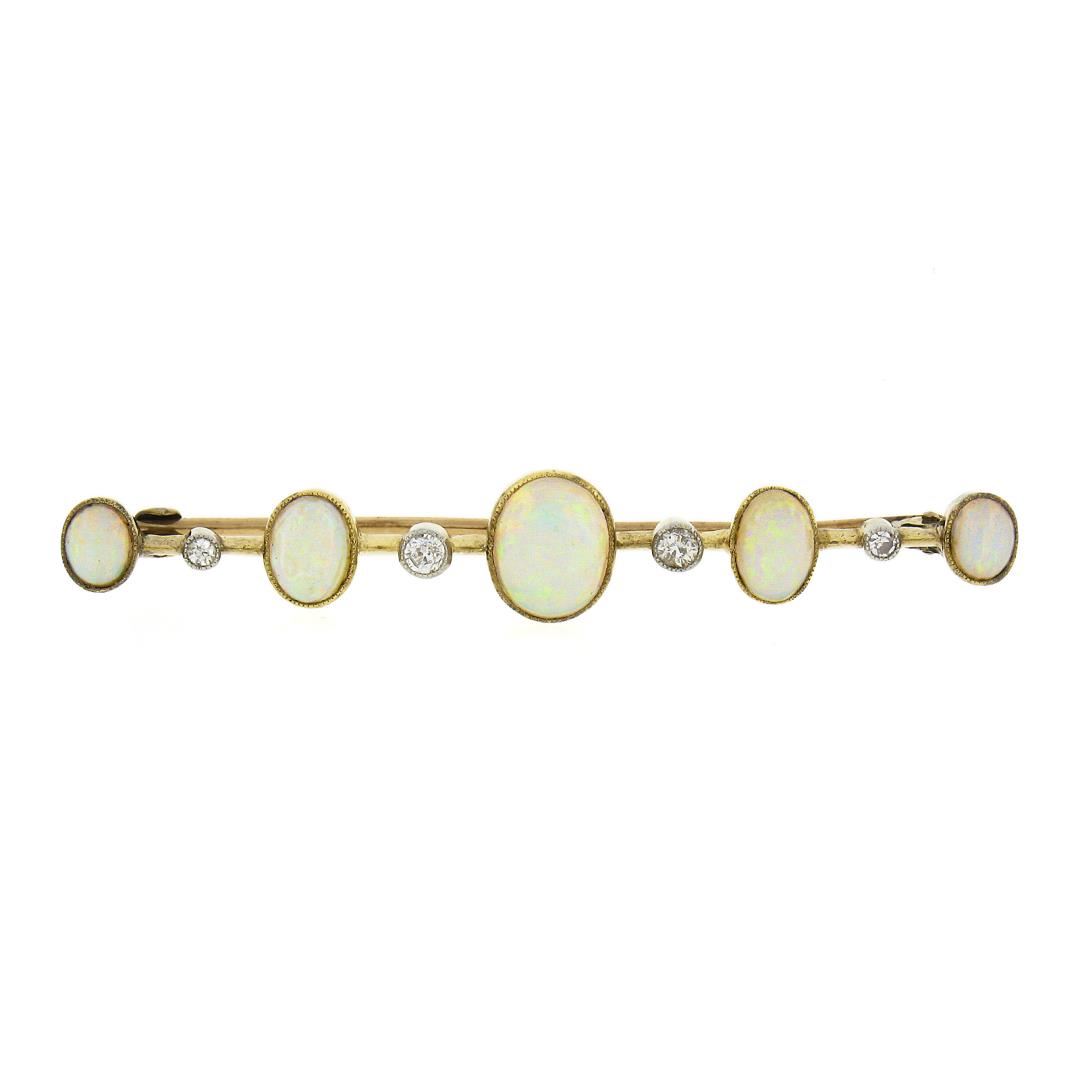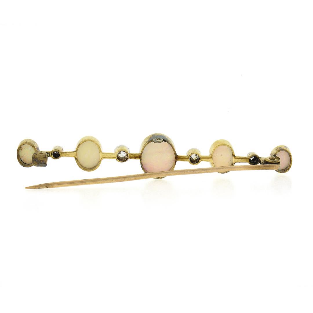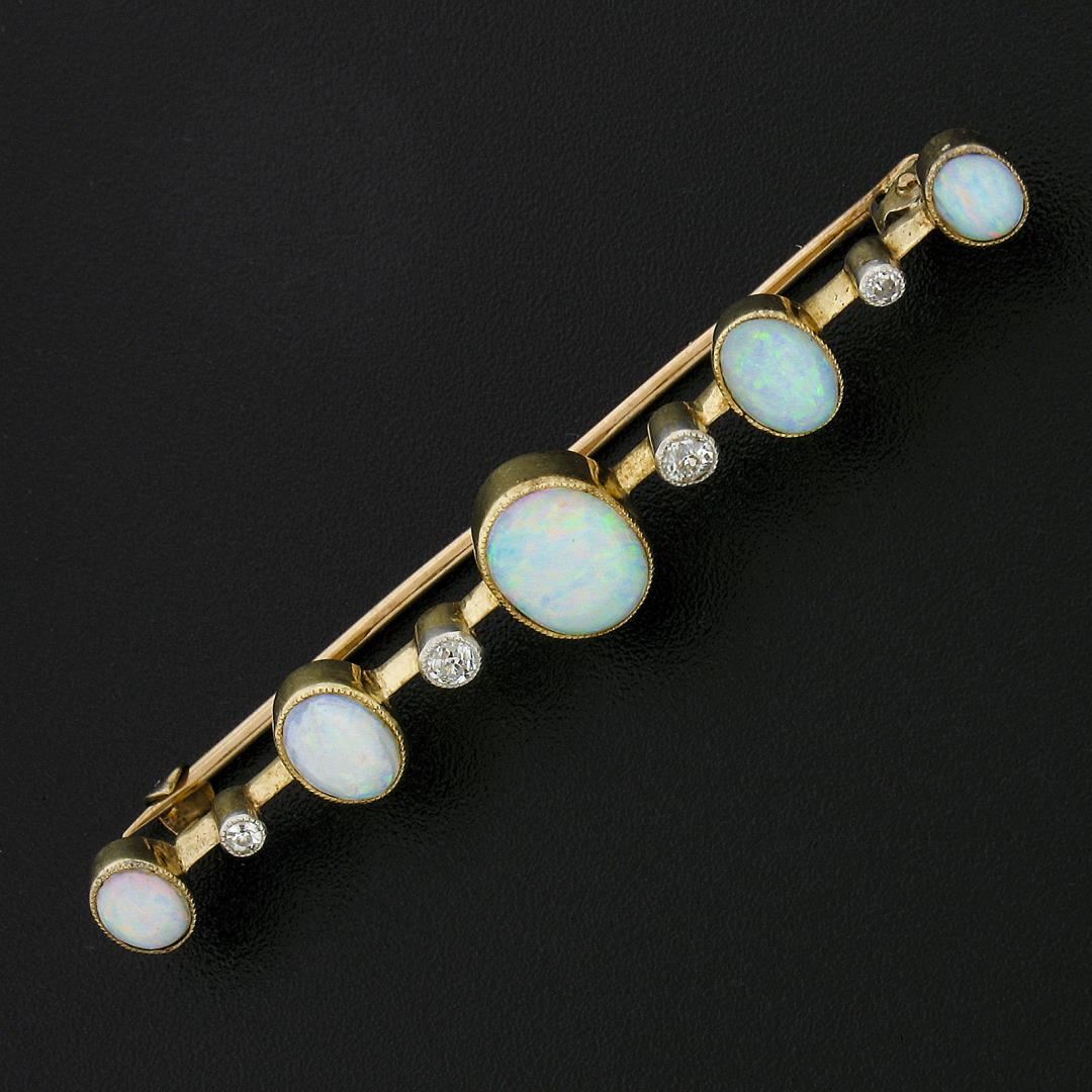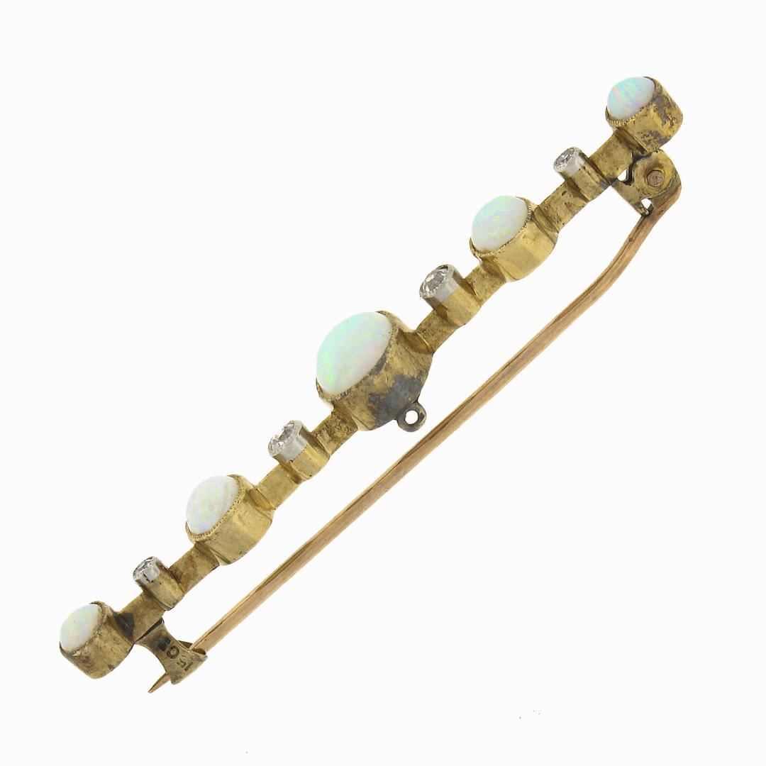 An antique solid 15k yellow gold bar pin brooch, with 5 oval cabochon cut natural opals (8.9x7.1mm to 5.1x4.1mm each), and 4 old single cut natural diamonds (H-I - SI1-I1 ; 0.17ctw). Measures 9.5x58.8mm and weighs a total of 4.52 grams.