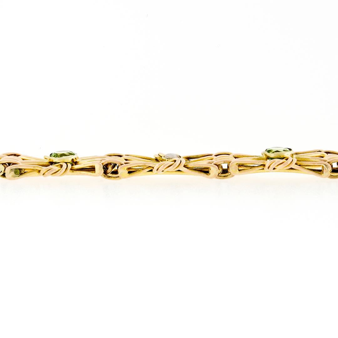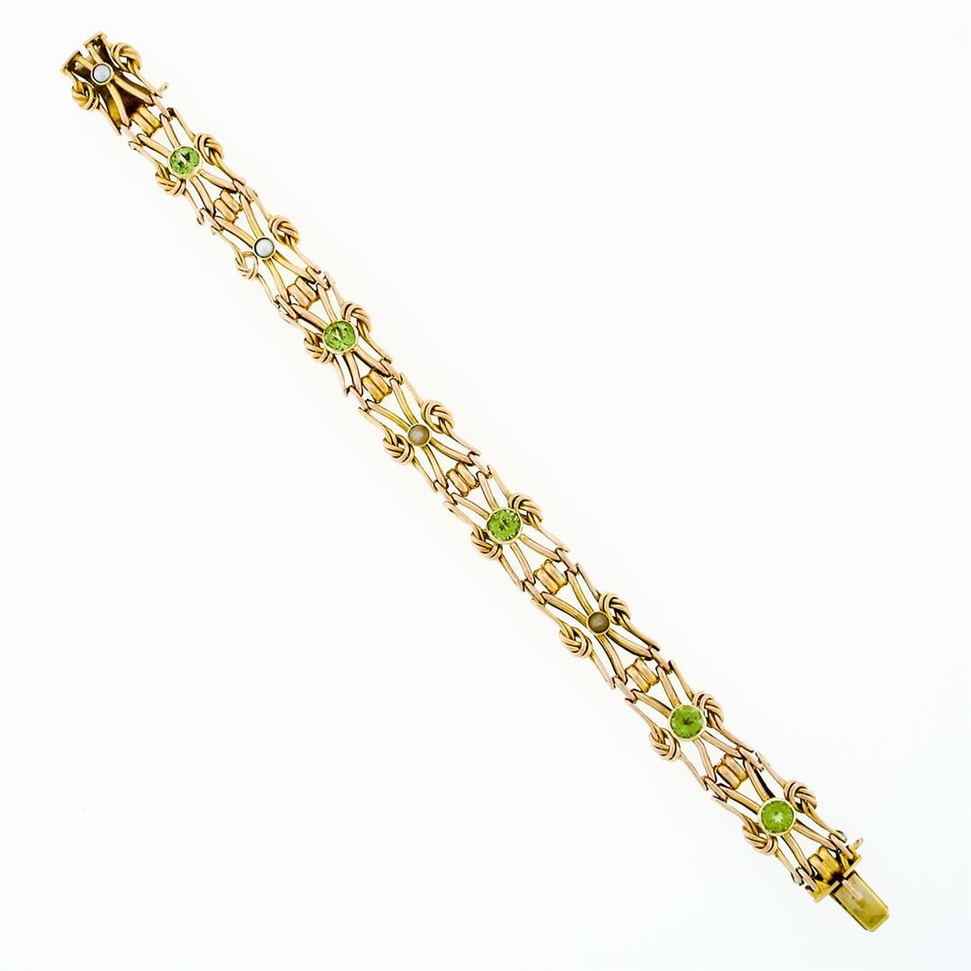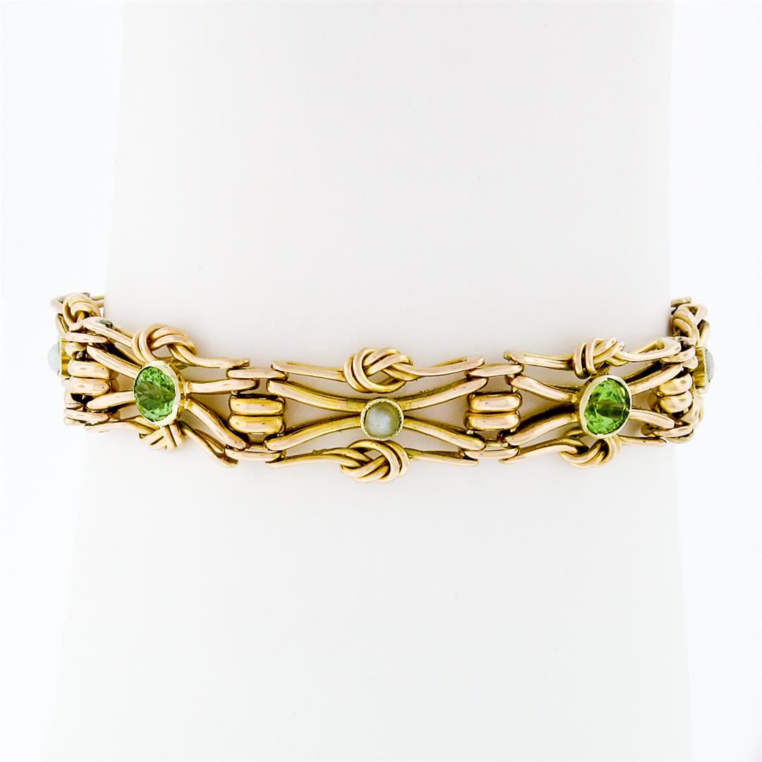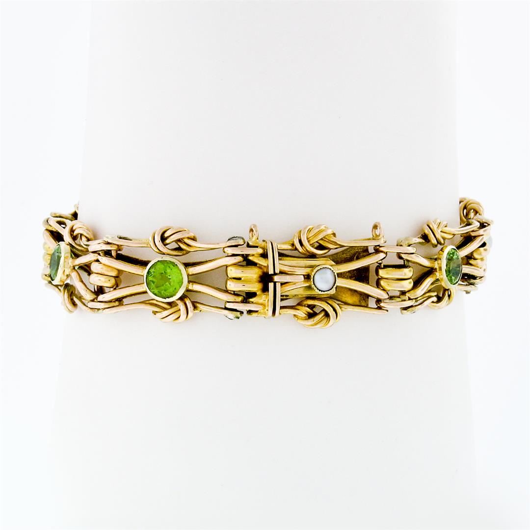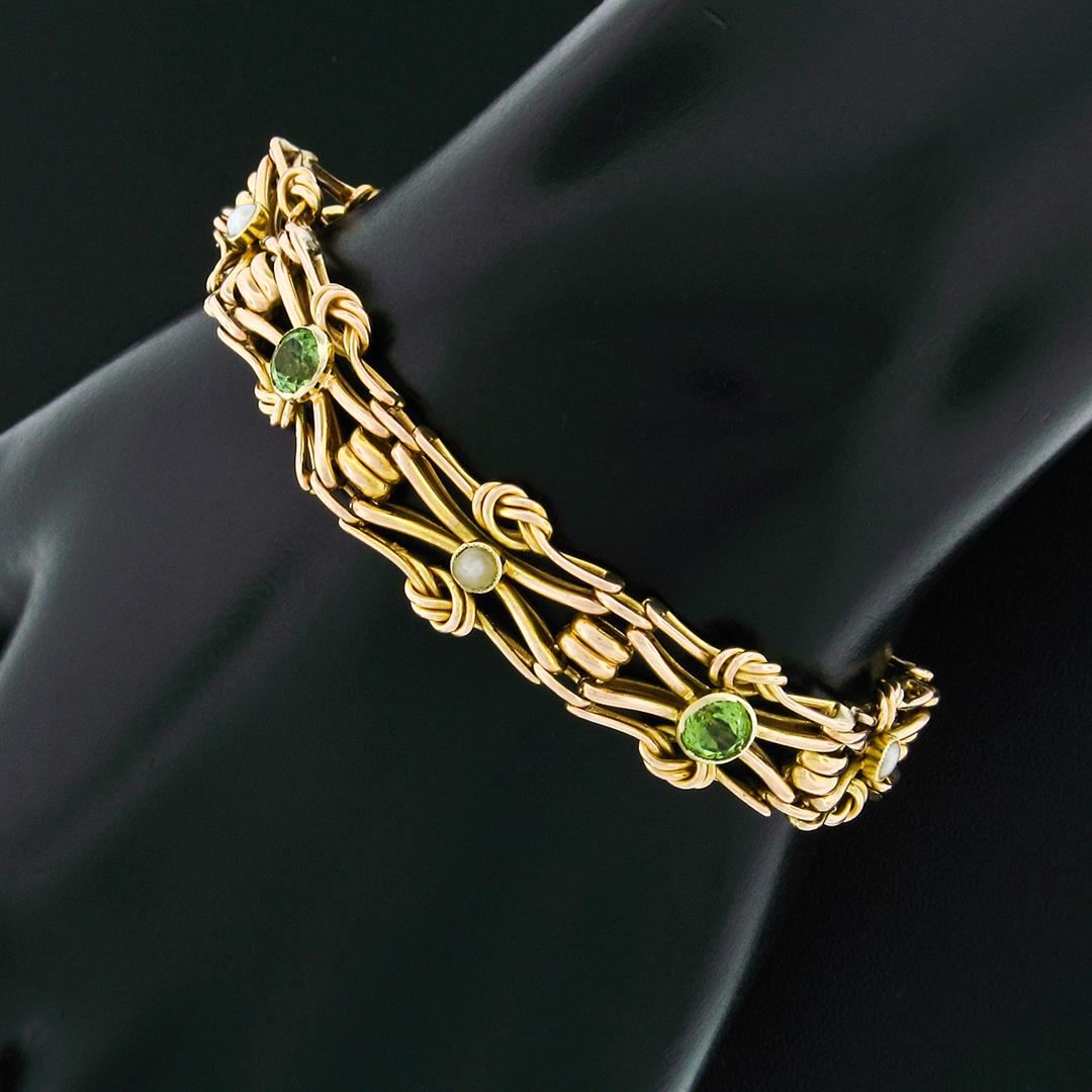 An antique victorian solid 15k yellow gold knot link bracelet, with 5 round cut natural peridots (2.5ctw ), & 4 round shape cultured pearls (3mm). It weighs a total of 15.58 grams, measures 11mm wide, and measures 6 inches in length.