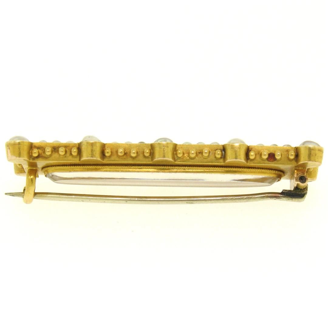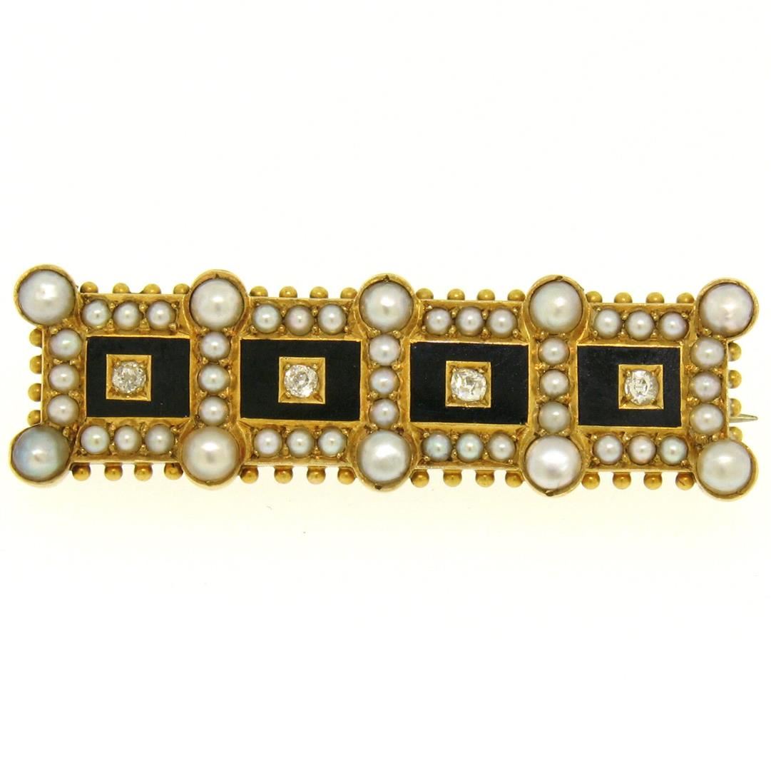 An antique solid 15k yellow gold bar pin brooch, featuring 49 round shape natural seed pearls (1.7-3.2mm), 3 old mine cut natural diamonds (F/G- VS1/VS2 ; 0.24ctw),and 4 rectangular shape natural black onyx (7.05x4.84mm). Measures 13.37x44.43mm and weighs a total of 8.35 grams.