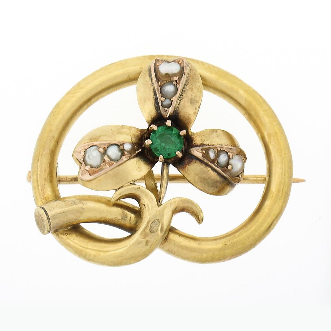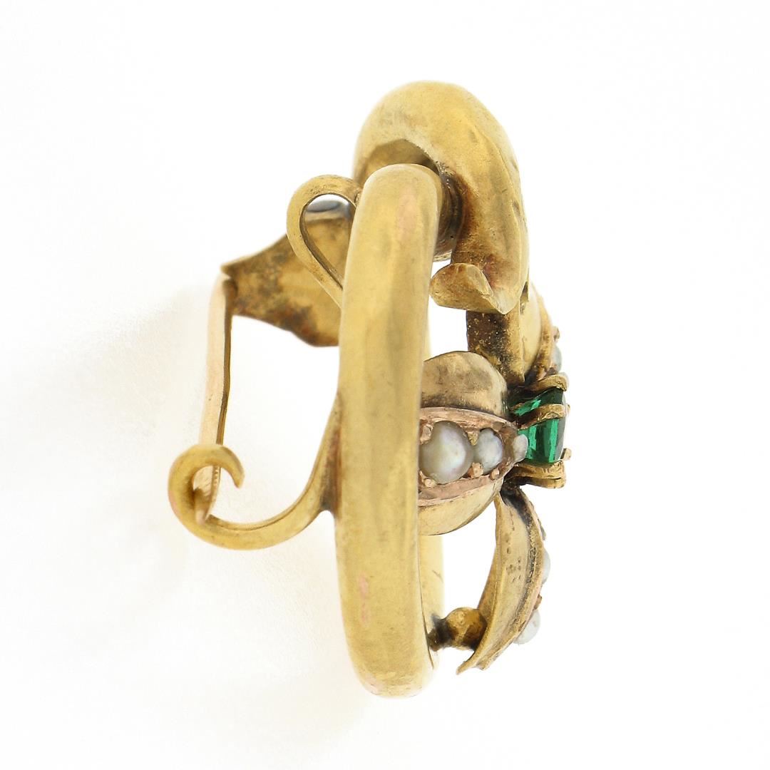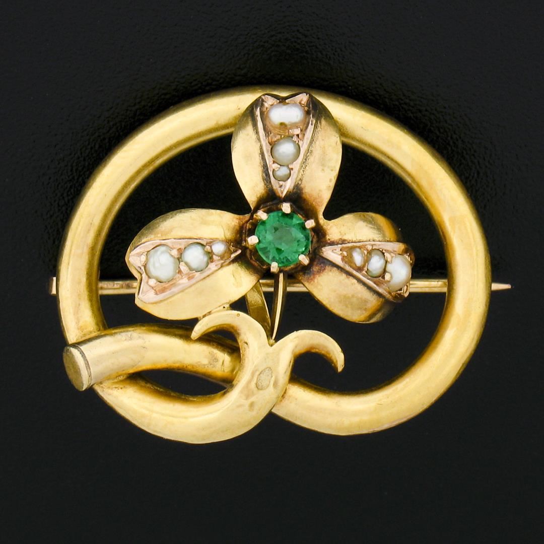 An antique solid 18k yellow gold brooch, with 9 round shape cultured seed pearls (2.4mm to 1mm each ), and 1 old round cut natural emerald (3.6mm / 0.20ct). Measures 0.9x1.1mm and weighs a total of 5.58 grams.