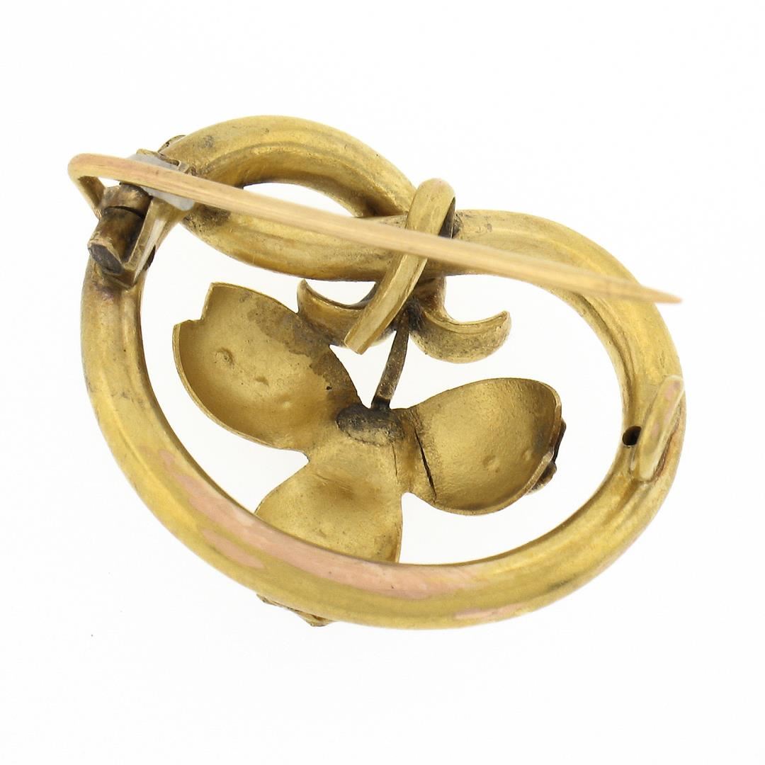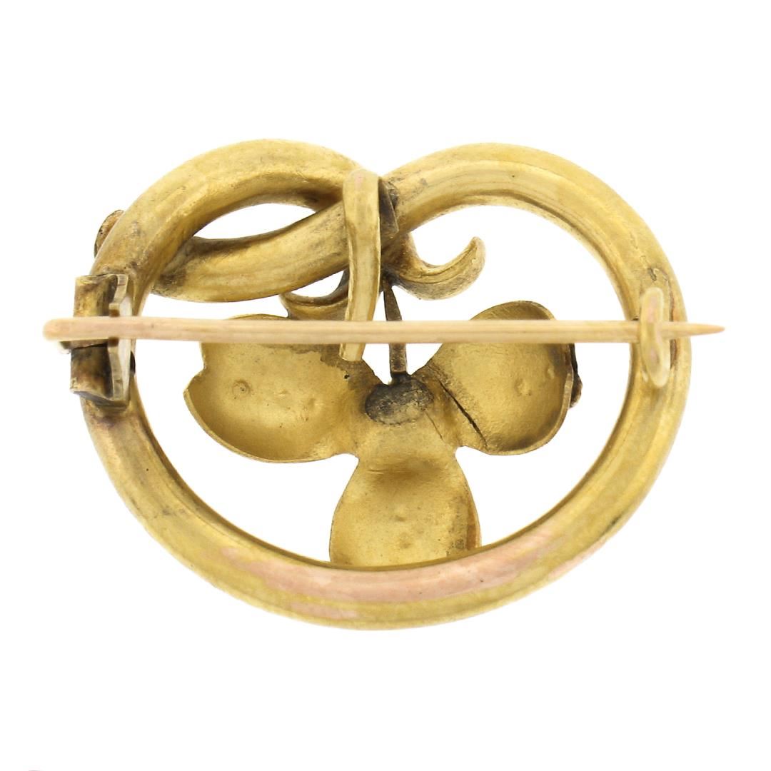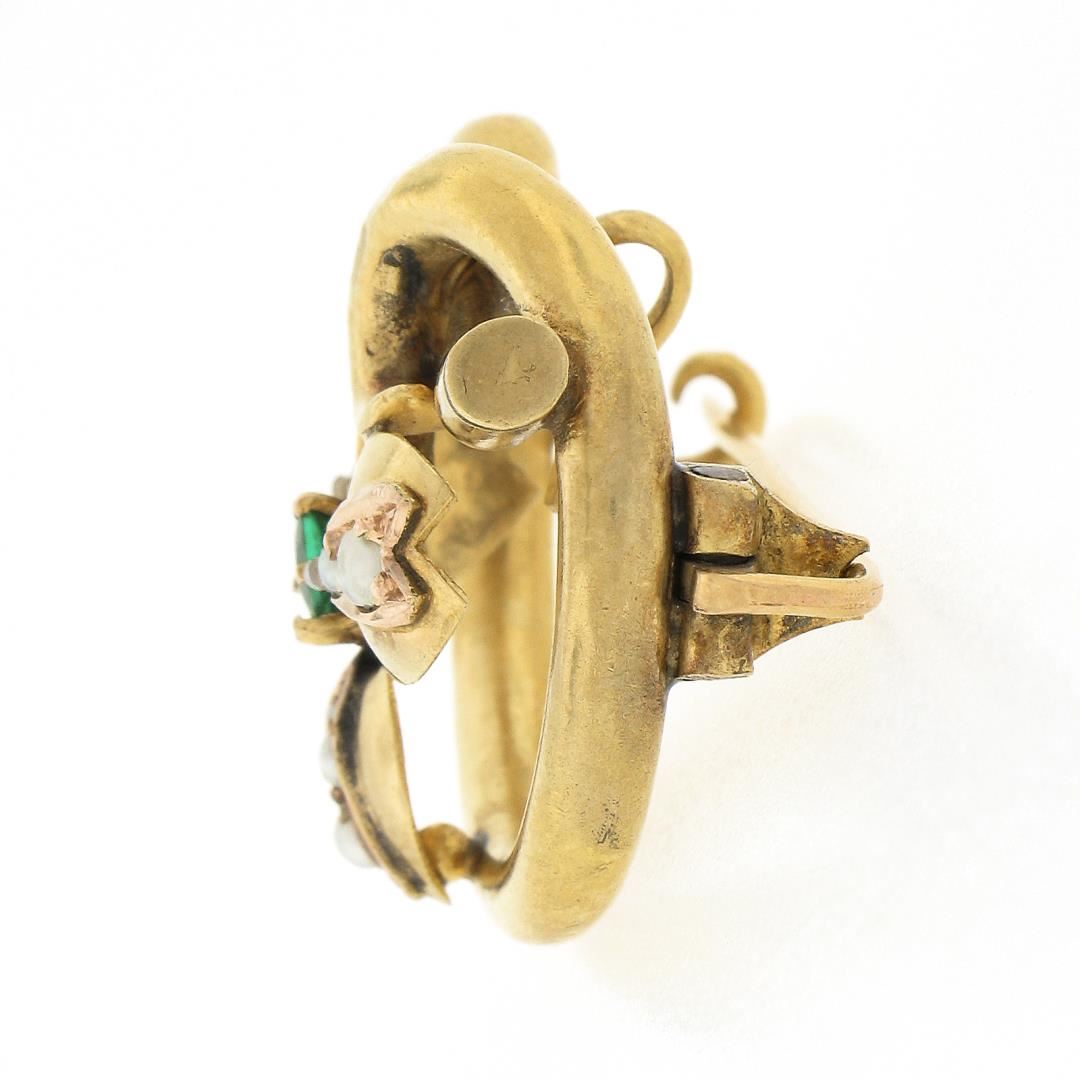 An antique solid 18k yellow gold brooch, with 9 round shape cultured seed pearls (2.4mm to 1mm each ), and 1 old round cut natural emerald (3.6mm / 0.20ct). Measures 0.9x1.1mm and weighs a total of 5.58 grams.