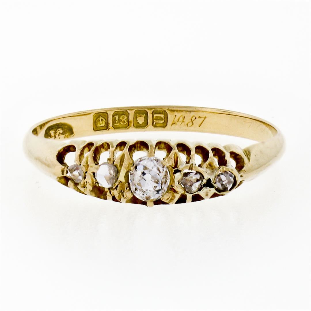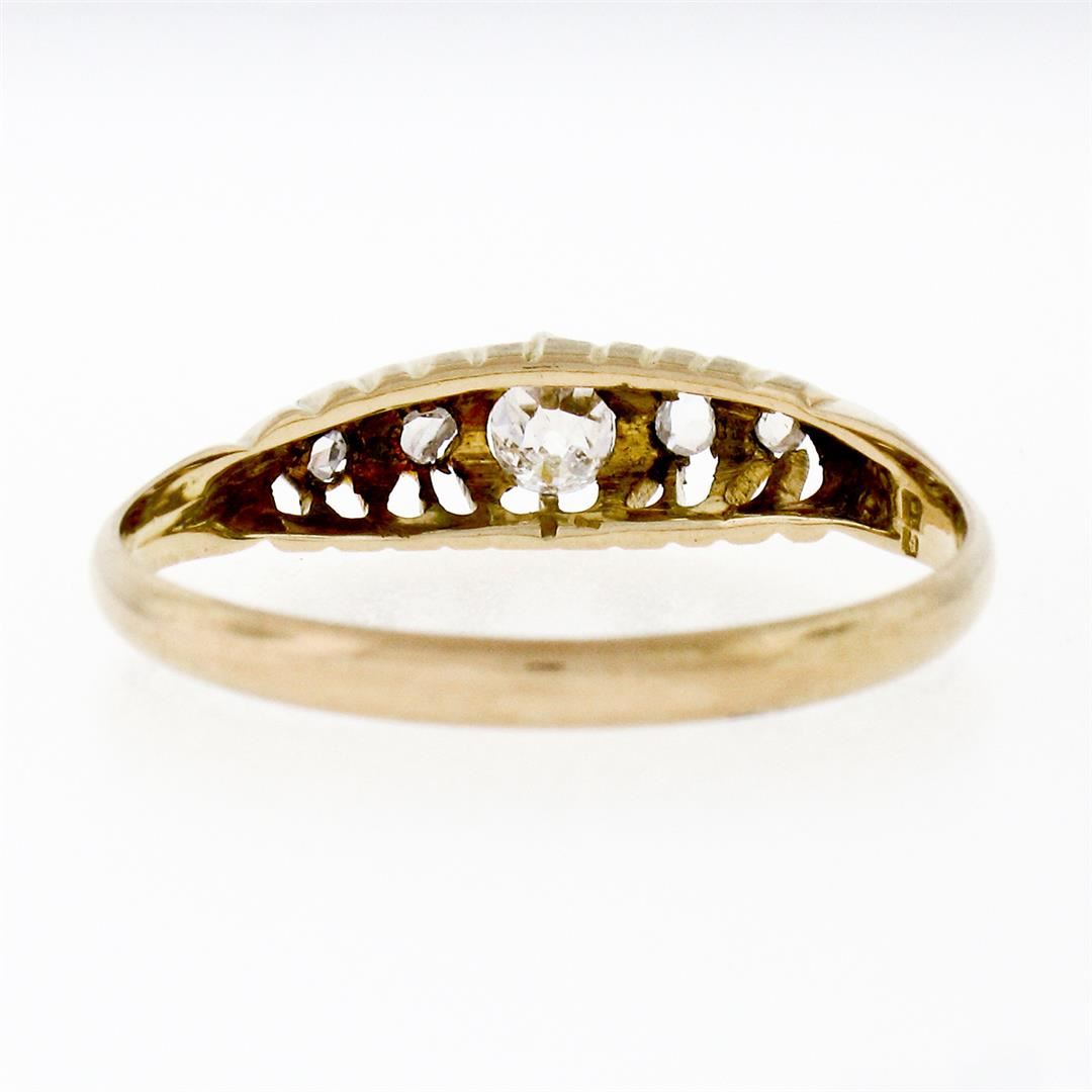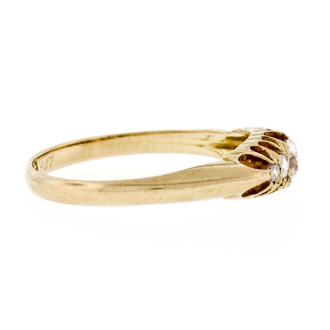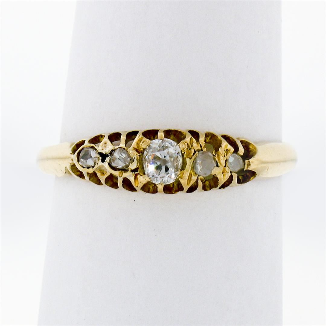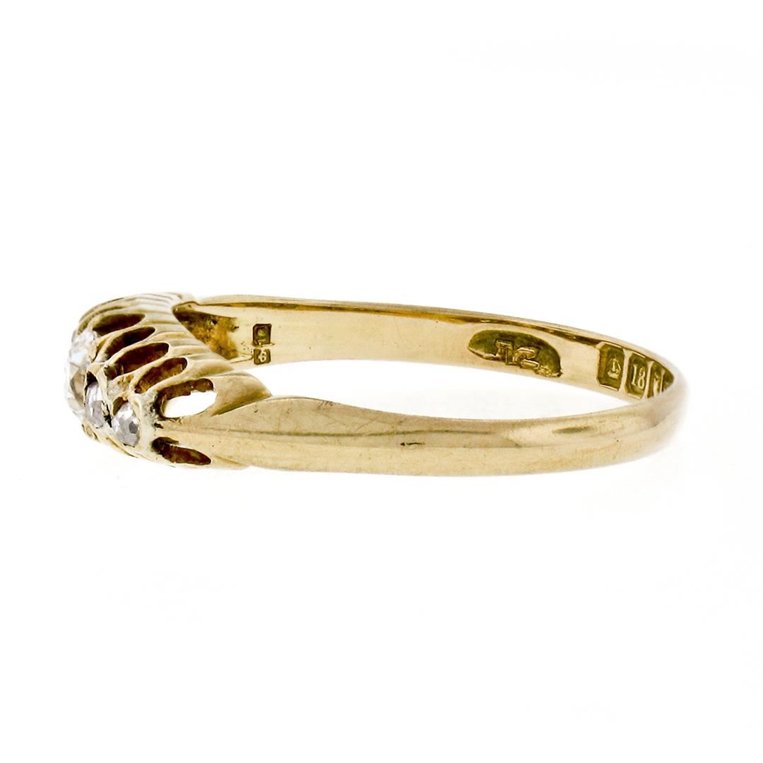 An antique solid 18k yellow gold band ring, 1 cushion old mine cut natural diamond (G - VS1; 0.20ct), and 4 rose cut natural diamonds (G/H- VS2/SI1 ; 0.12ctw ). The ring is size 8.0, weighs a total of 2.15 grams, and measures 5.0mm wide.