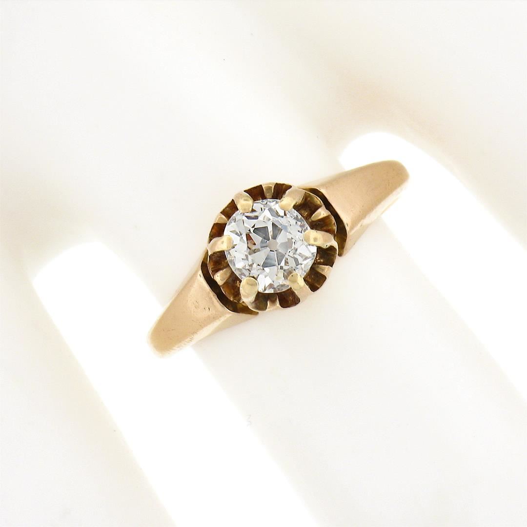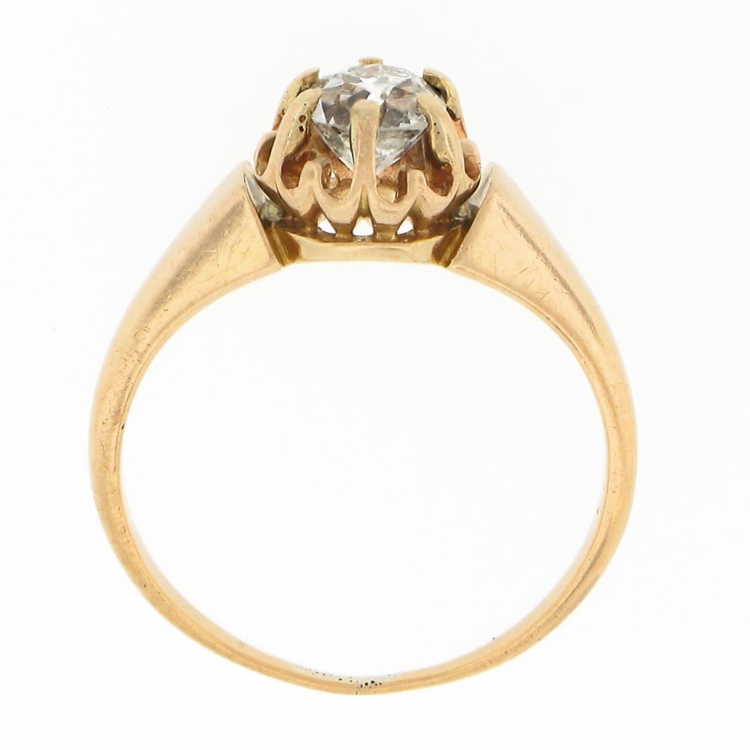 An antique solid 18k yellow gold engagement ring, with 1 old mine cut natural diamond (I - VS2 ; 0.65ct). The ring is size 5.5, weighs a total of 2.83 grams, and measures 7.15mm wide.