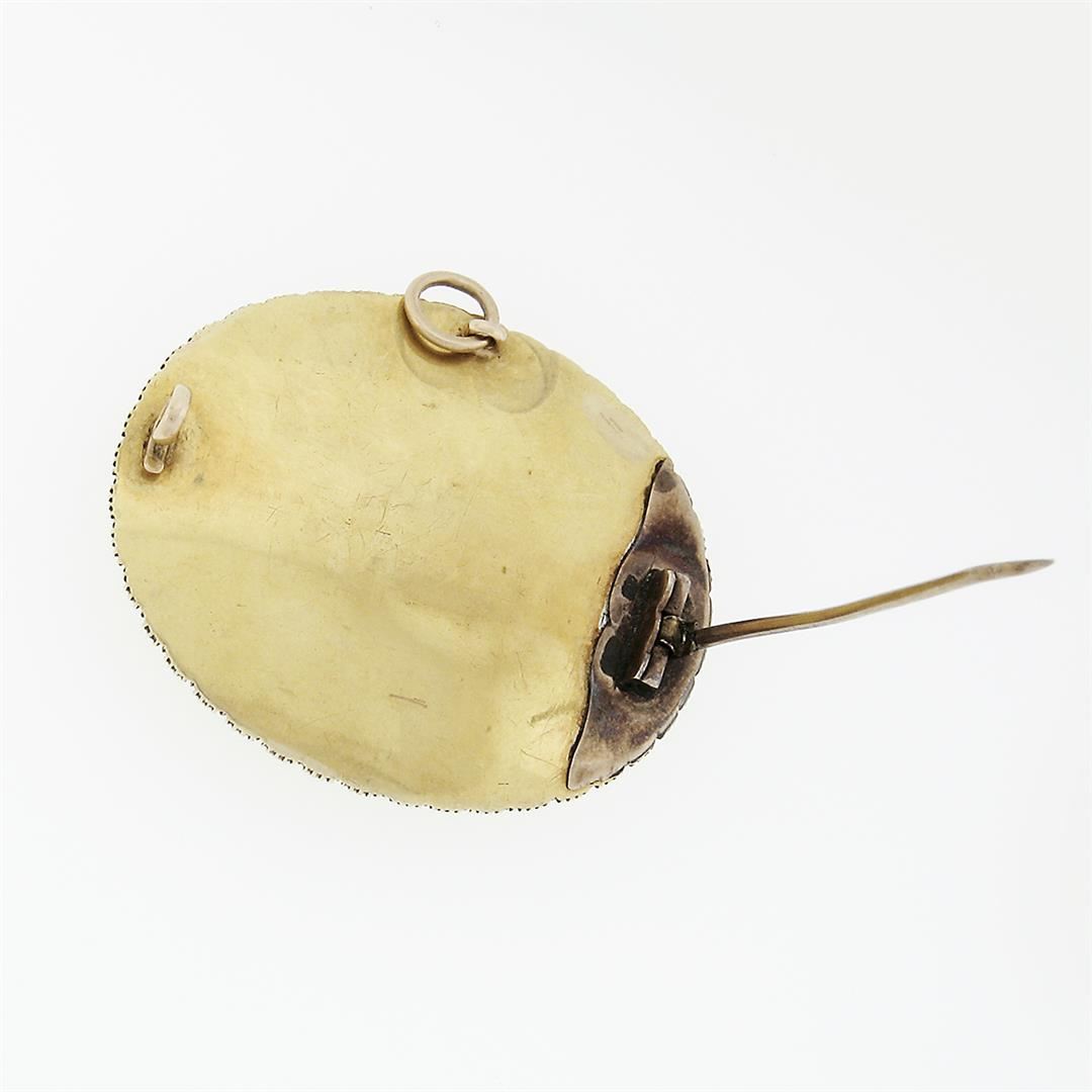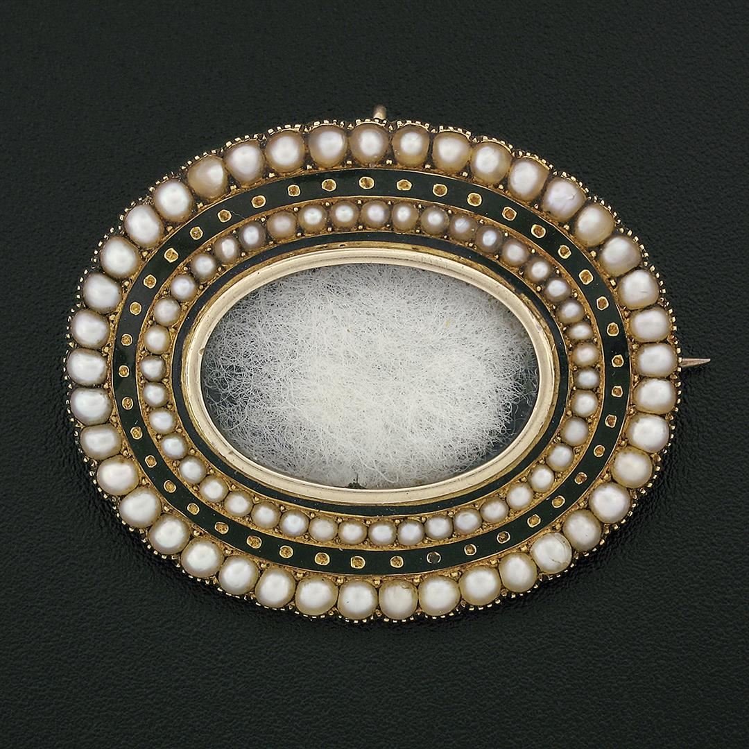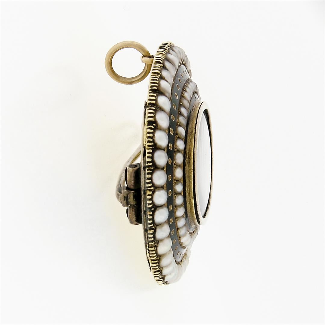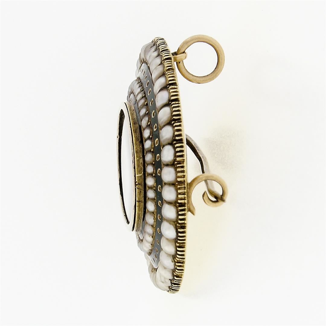 An antique victorian solid 18k yellow gold & black enamel work mourning pin brooch pendant, 42 round shape seed pearls ( 2.00mm), & 42 oval shape seed pearls ( 2.70x2.25mm ). Measures 32.22x39.36mm and weighs a total of 15.44 grams.