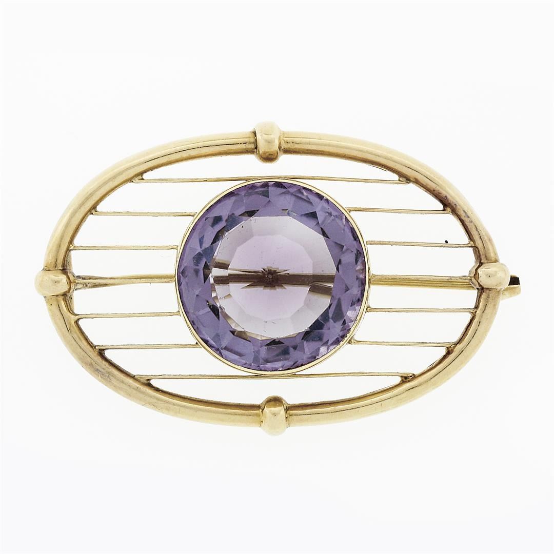 A Victorian solid 18k yellow gold pin brooch, with 1 round faceted cut natural amethyst (17.3mm ; 15.28ct). Measures 30.3x45.7mm and weighs a total of 12.40 grams.