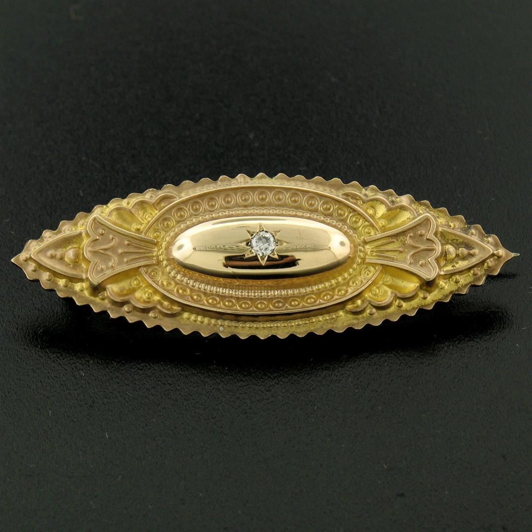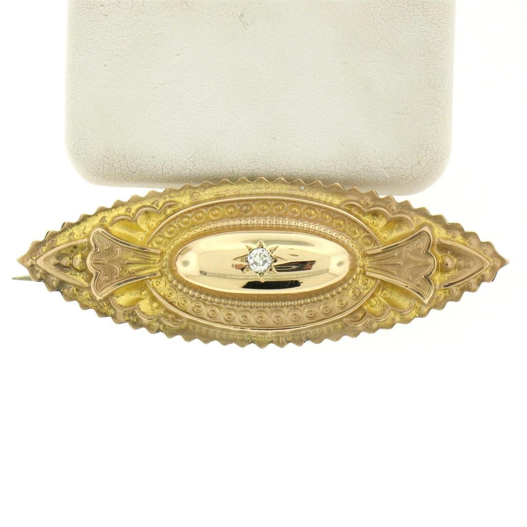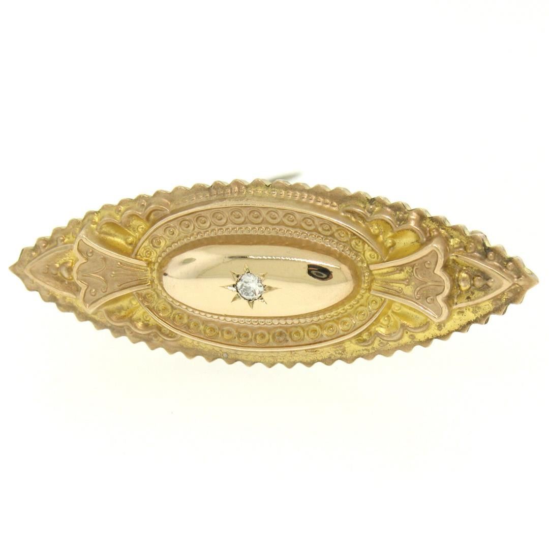An antique victorian solid 9k yellow gold featuring 1 old mine cut natural diamond (G - VS2 ; 0.10ct). Measures 16.25x46.5mm and weighs a total of 2.80 grams.