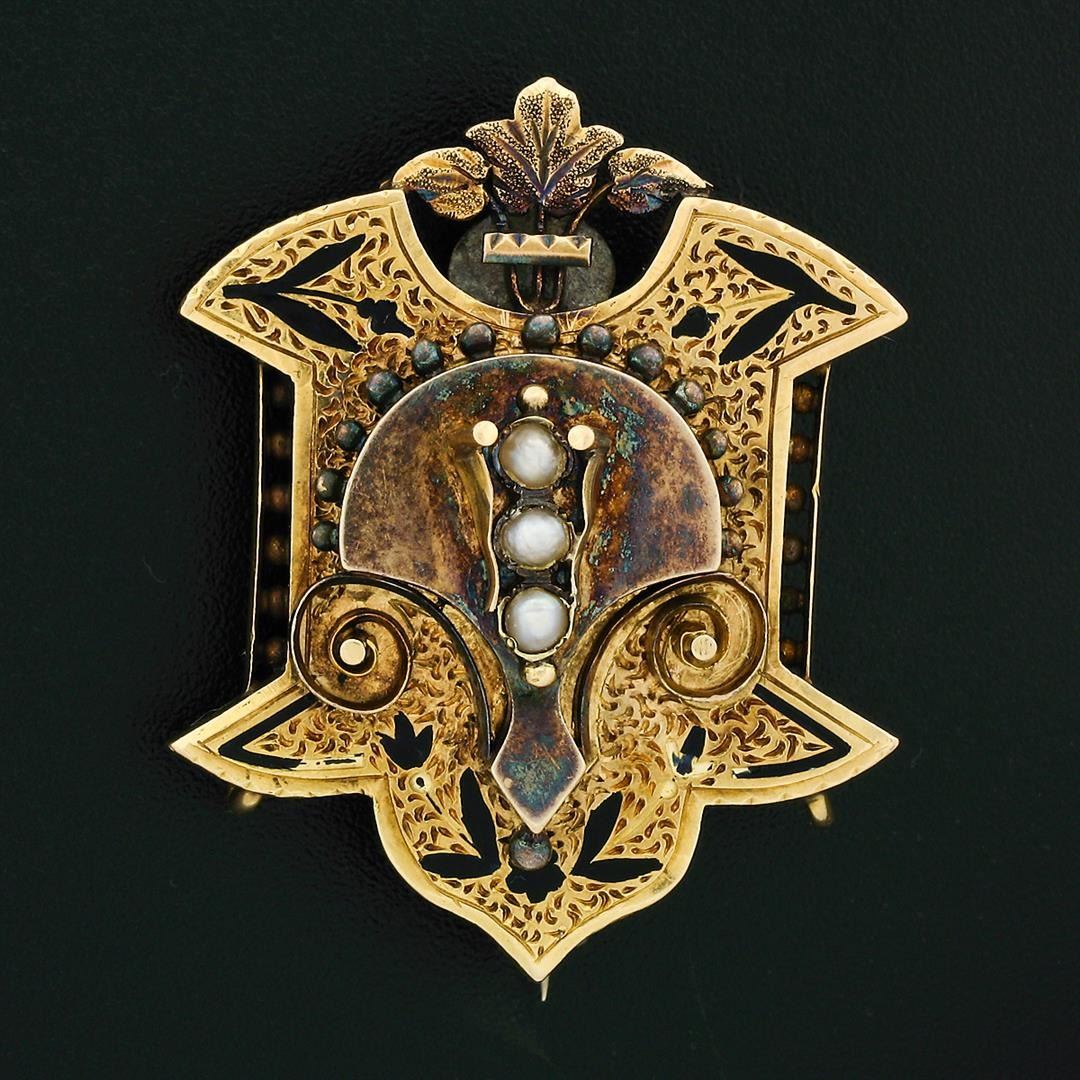 A Victorian solid 18k yellow gold pin brooch, with black enamel work and 3 round shape natural seed pearls (2.8mm). Measures 38.33x31.07mm and weighs a total of 13.90 grams.