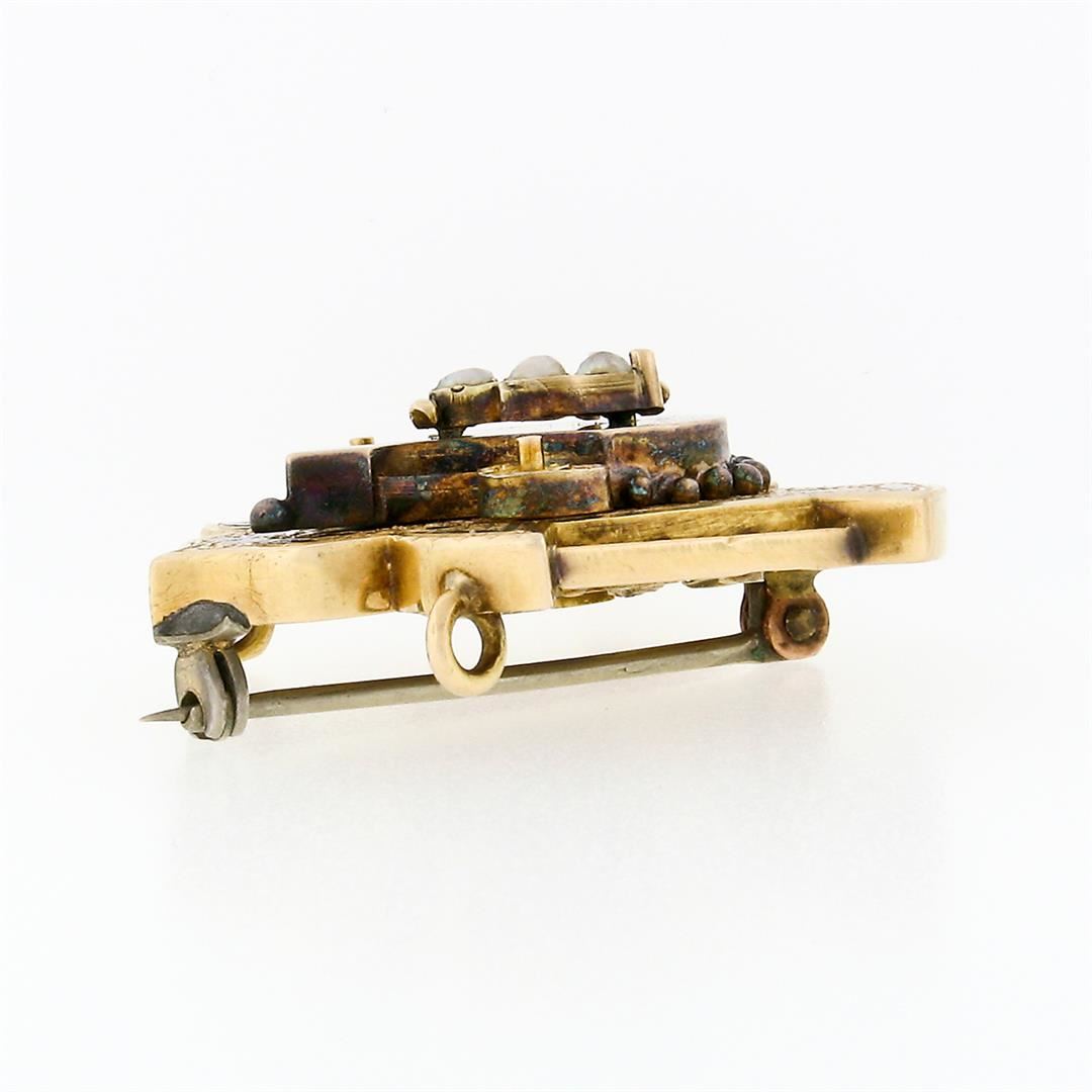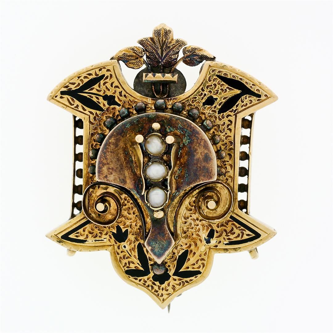 A Victorian solid 18k yellow gold pin brooch, with black enamel work and 3 round shape natural seed pearls (2.8mm). Measures 38.33x31.07mm and weighs a total of 13.90 grams.
