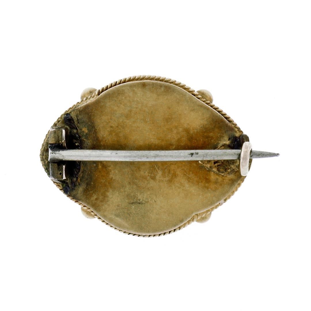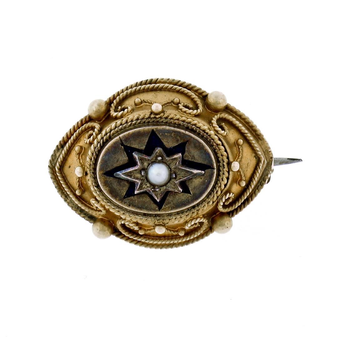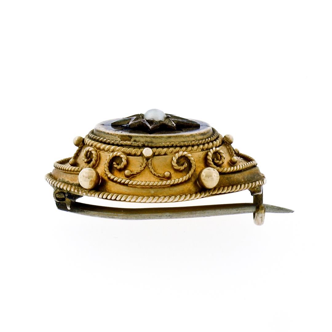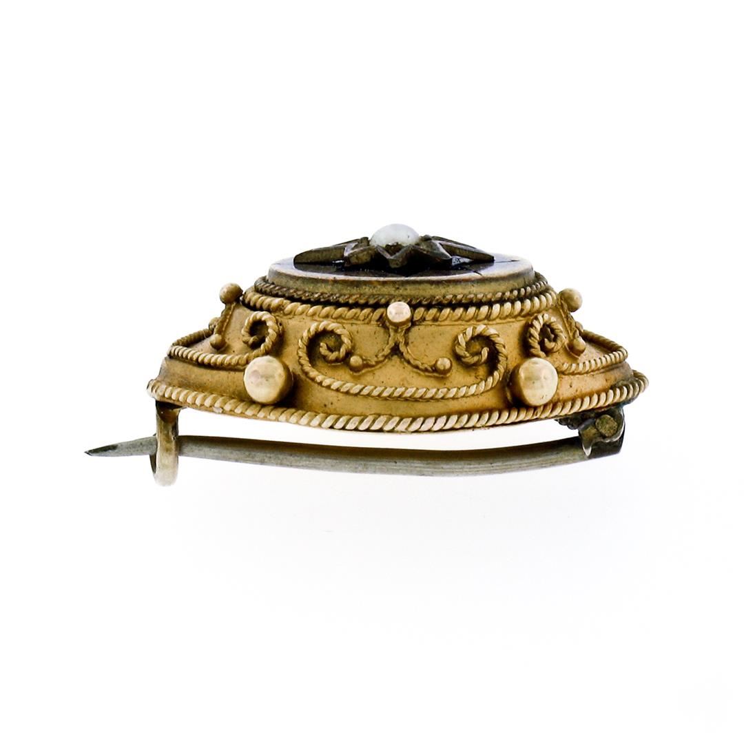 An antique solid 14k yellow gold puffed twistted wire brooch, with 1 round shape natural seed pearl (2.25mm). Measures 15.60x20.40mm and weighs a total of 2.47 grams.