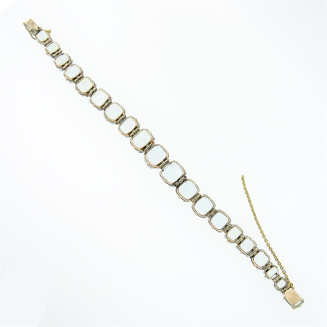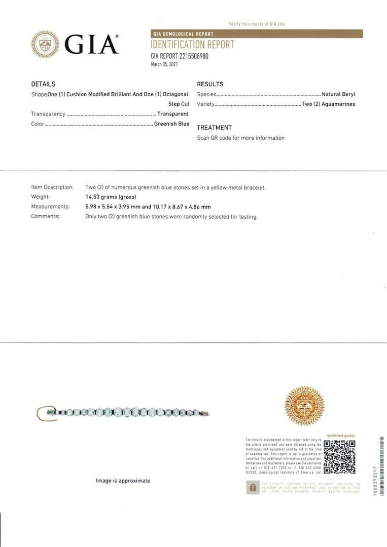 An antique victorian solid 8k yelllow gold line bracelet, with 20 Gia certified various hand cut shapes natural aquamarines (25ctw) It weighs a total of 14.53 grams, measures 10.79mm wide, and measures 6.25 inches in length. Comes with all original relevant certifications.