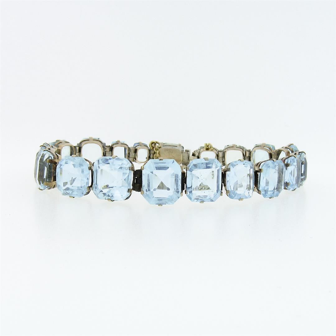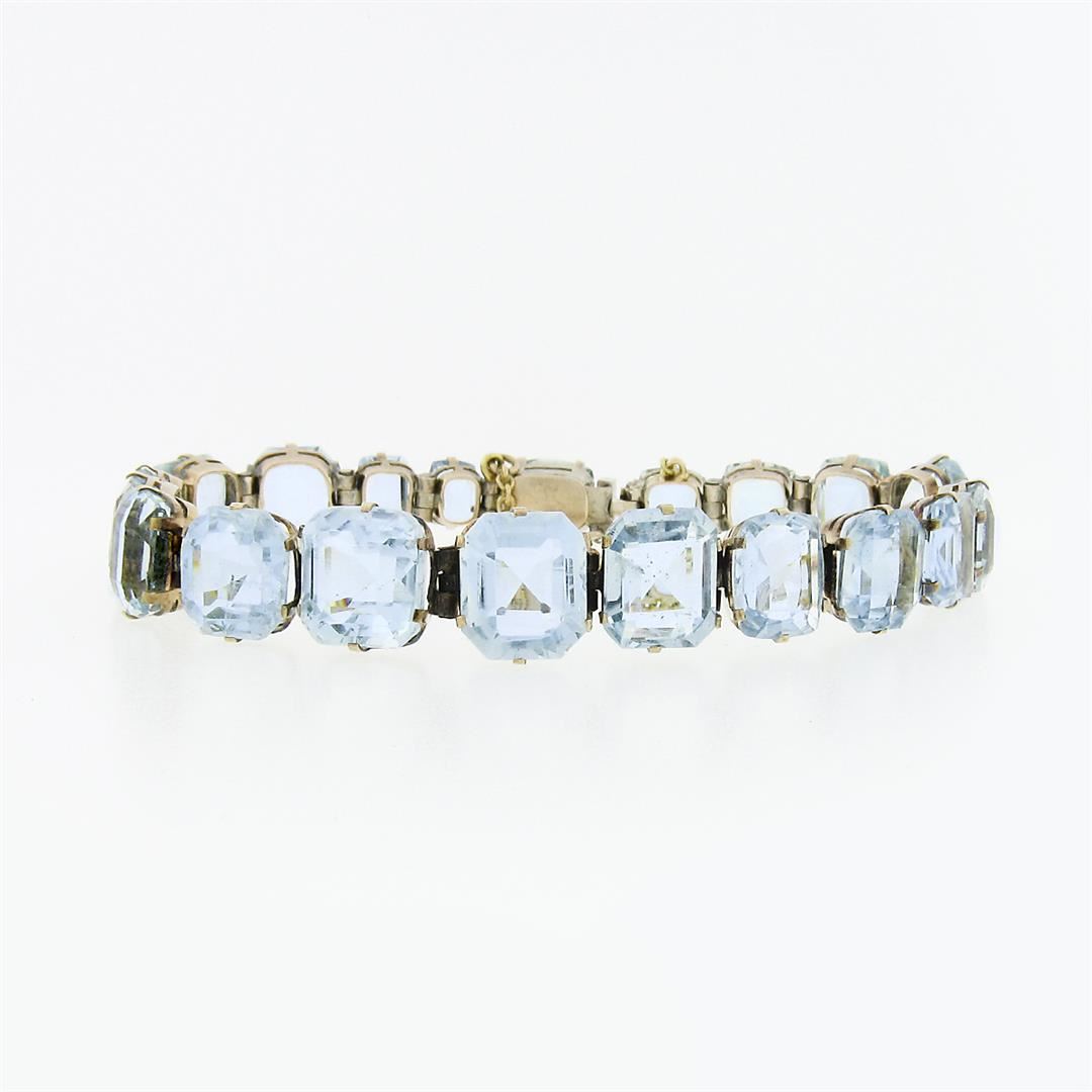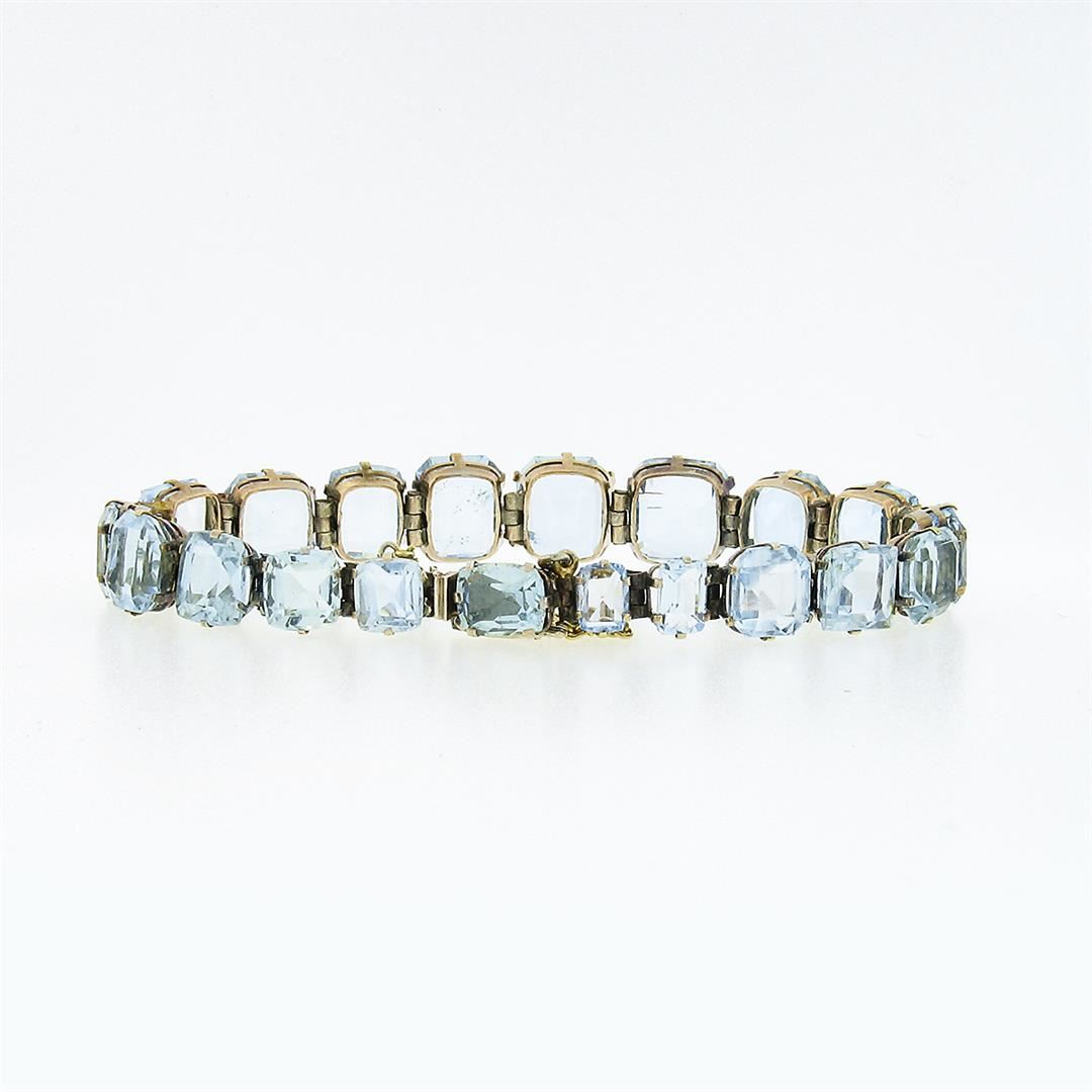 An antique victorian solid 8k yelllow gold line bracelet, with 20 Gia certified various hand cut shapes natural aquamarines (25ctw) It weighs a total of 14.53 grams, measures 10.79mm wide, and measures 6.25 inches in length. Comes with all original relevant certifications.