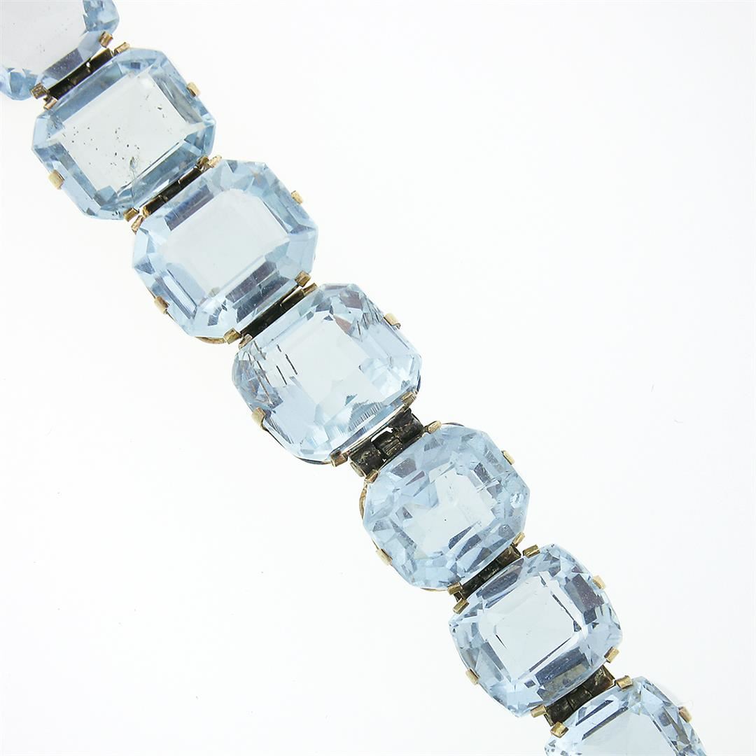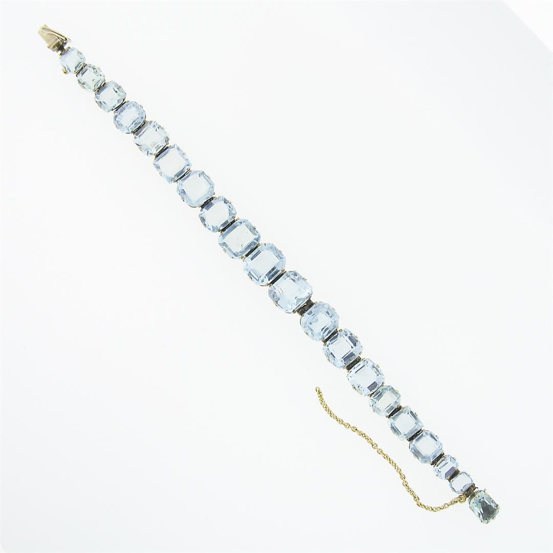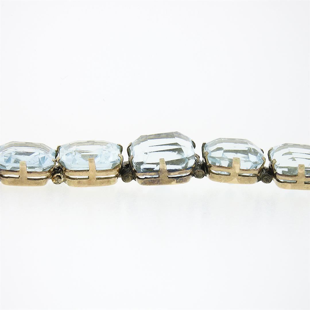 An antique victorian solid 8k yelllow gold line bracelet, with 20 Gia certified various hand cut shapes natural aquamarines (25ctw) It weighs a total of 14.53 grams, measures 10.79mm wide, and measures 6.25 inches in length. Comes with all original relevant certifications.